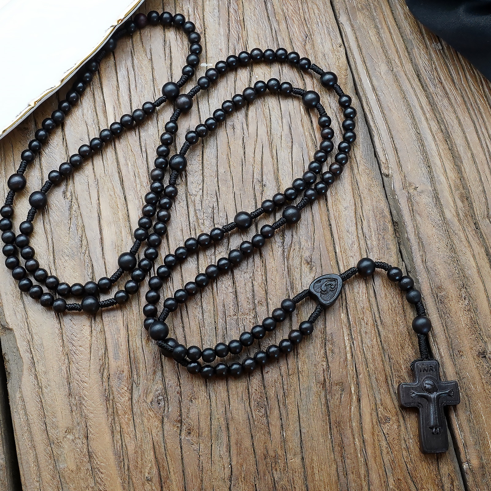 Handwoven 15-decade rosary featuring 6 mm ebony beads and 8 mm Pater beads. Comes with a storage pouch and devotional card for practical use.