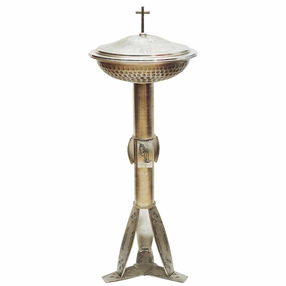 Baptismal font in brass casting with drop-shaped enamels. Hammered upper tank, diameter 40 cm.
