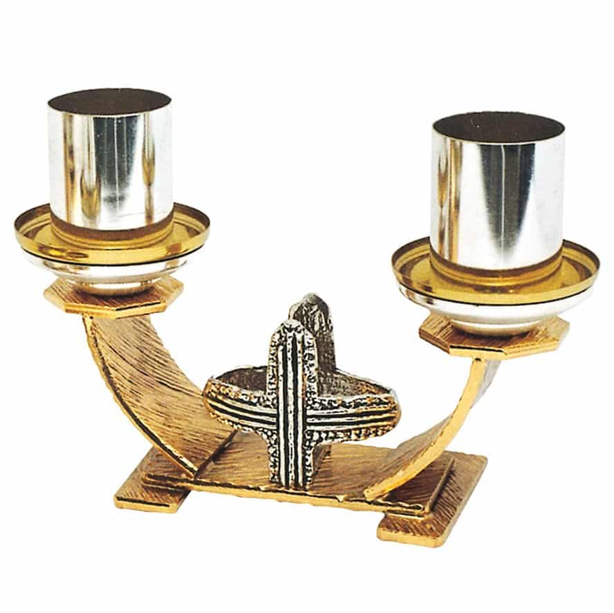 Two-tone brass candelabrum with two branches. On base silvered cross.