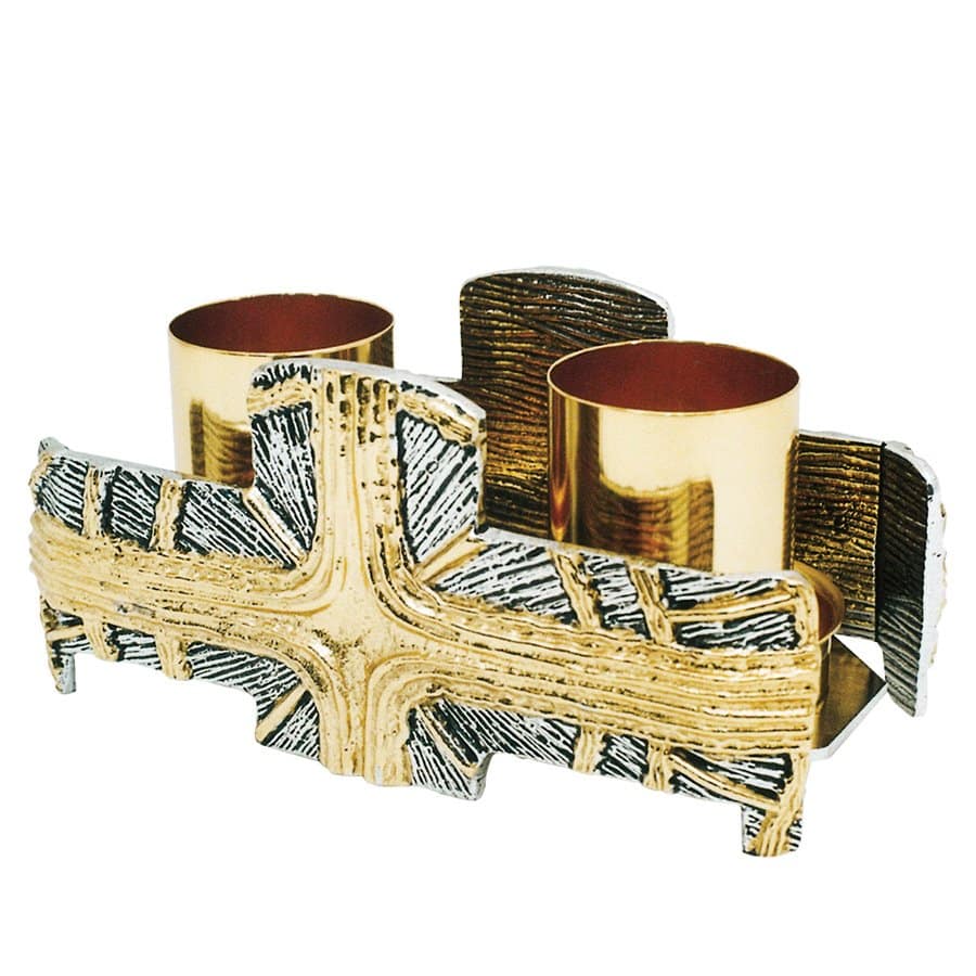Two-tone brass casting candelabrum with two branches. Golden sunburst crosses on silvered background.