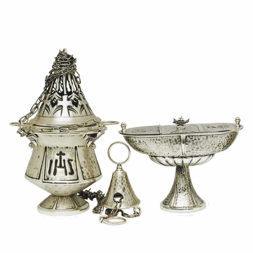Brass censer with boat crafted by hand with hammering with IHS and Pax symbols. The traditional elongated boat is furnished with spoon. The interior is removable.