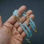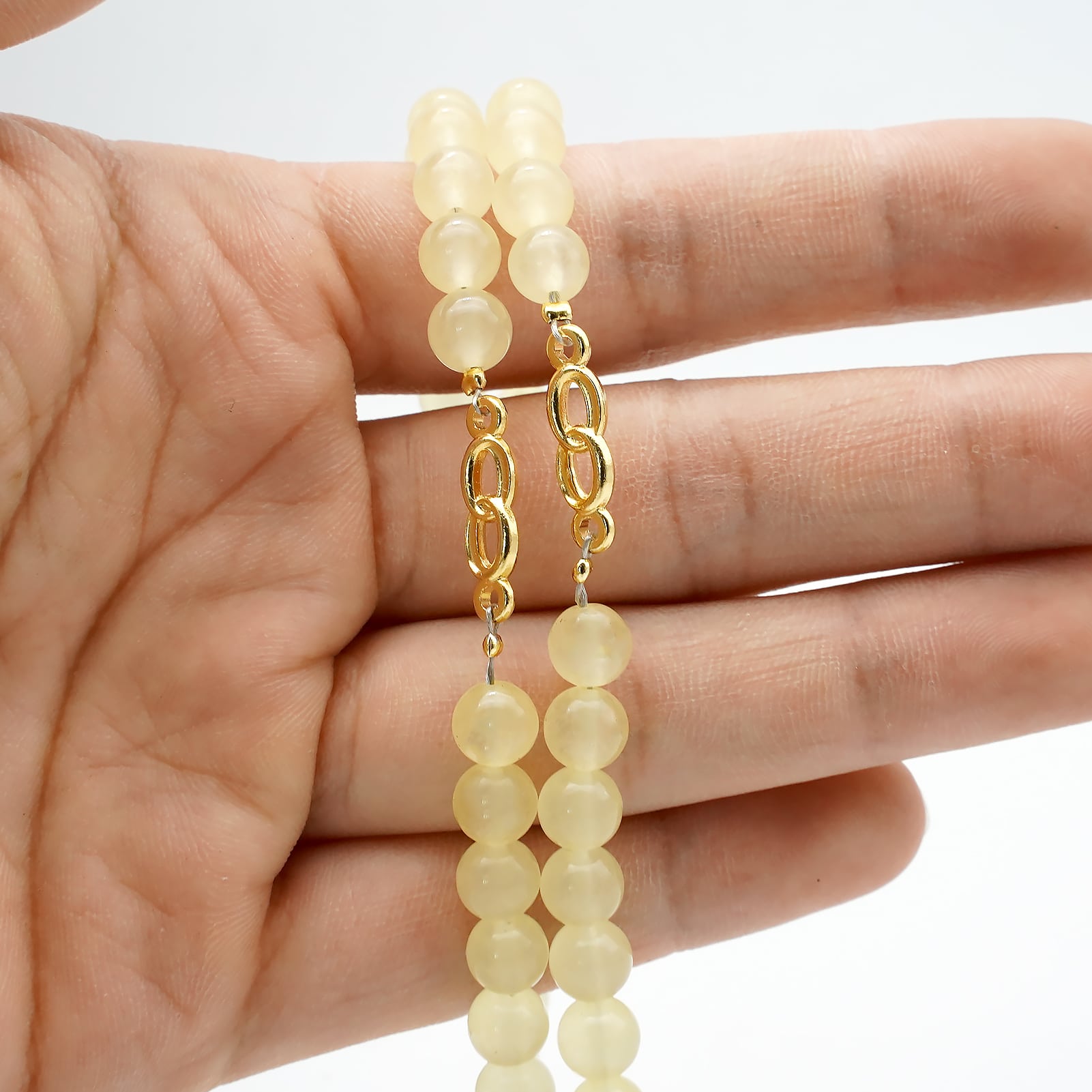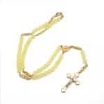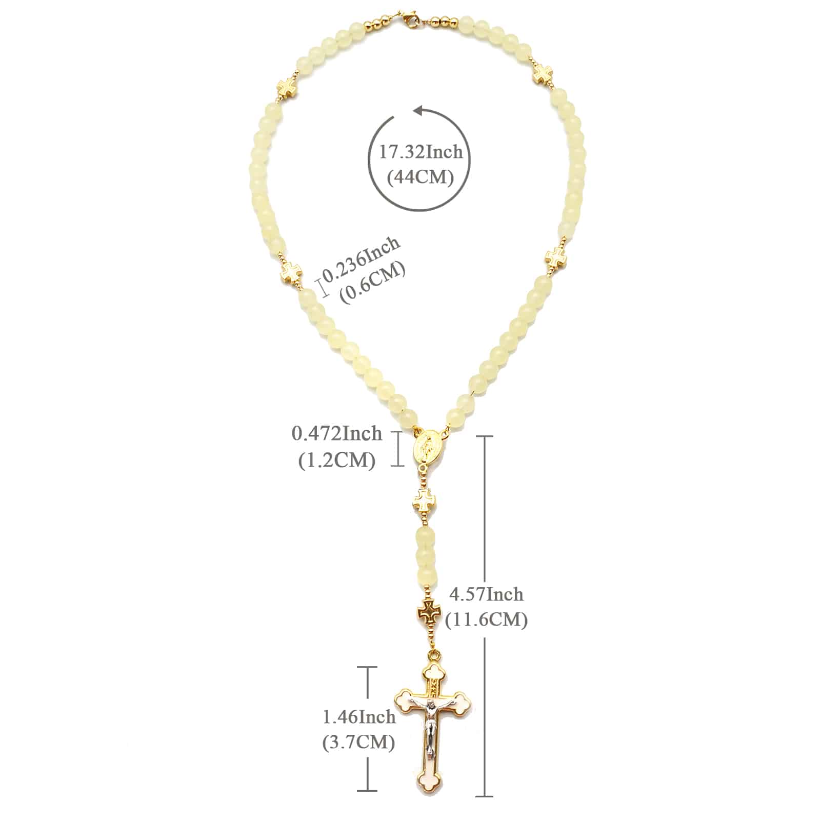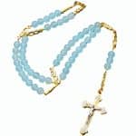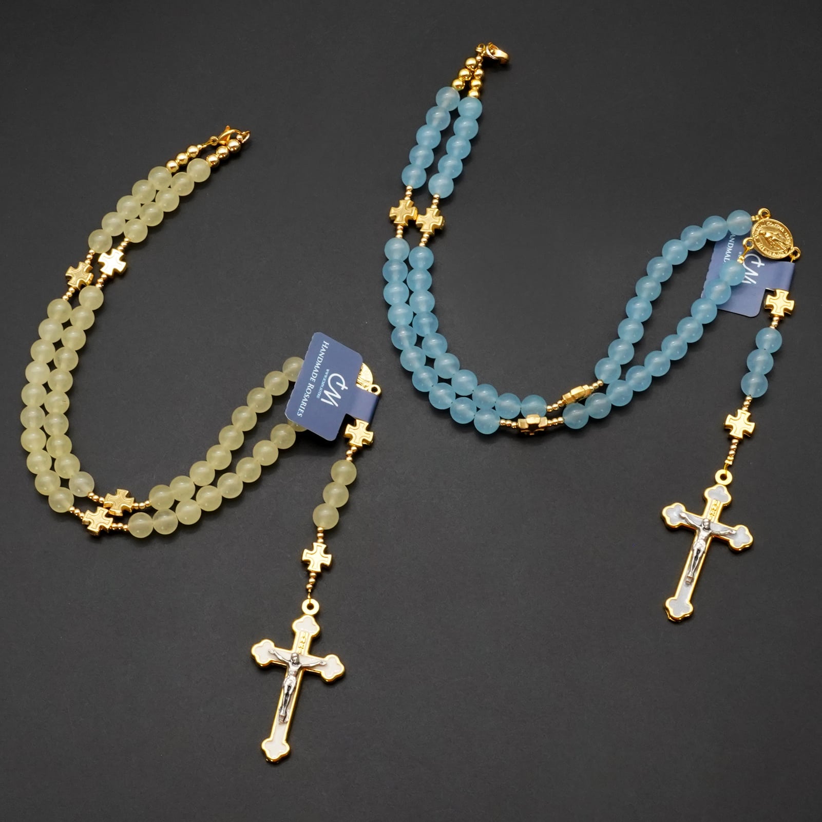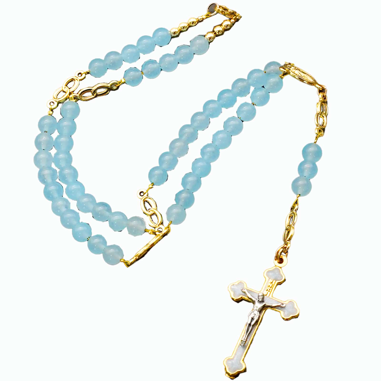 This rosary is a stunning piece made of chalcedony beads with a lobster clasp for necklace. The accessories are imported from Italy, and the cross is crafted using an enamel process. It comes in a beautiful gift box, making it a perfect gift for any occasion.