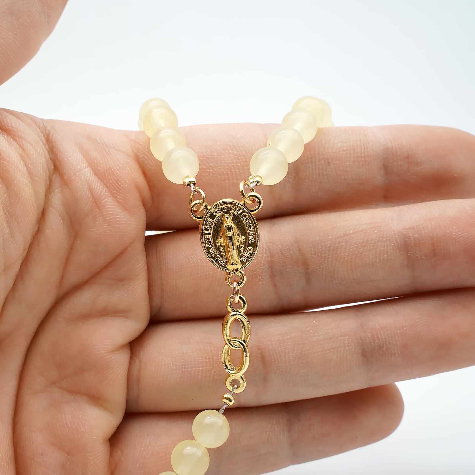 Beautiful chalcedony bead rosary with enamel cross and Italian accessories, comes in a gift box.