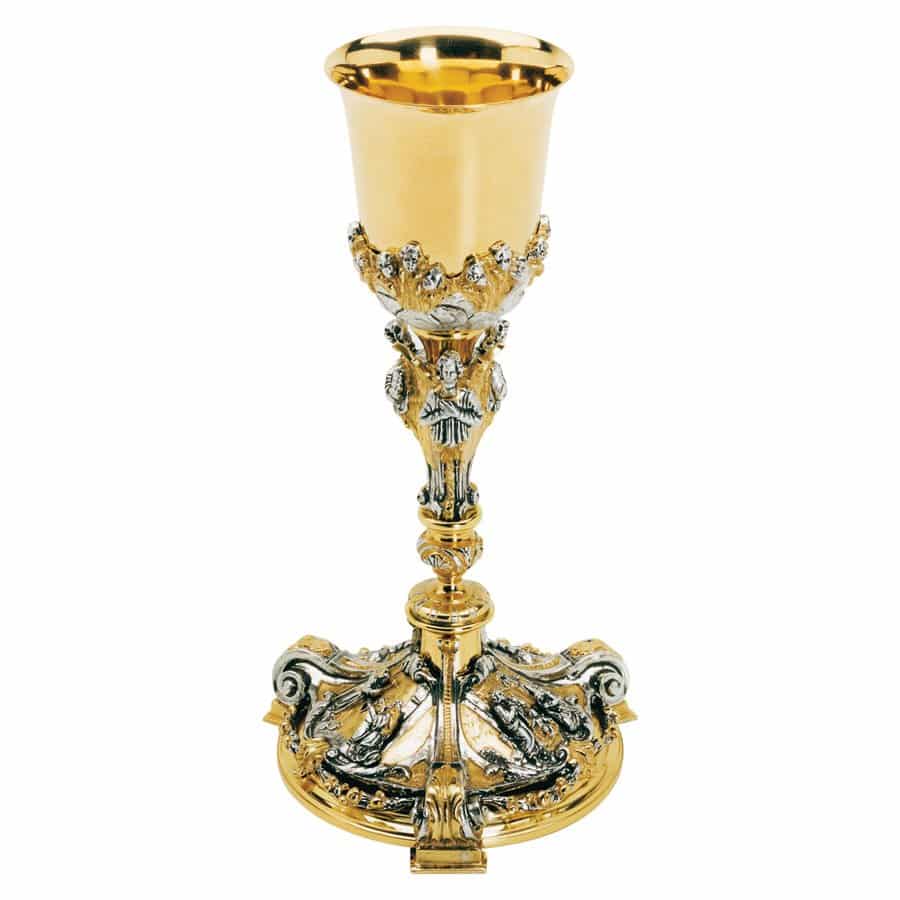 Two-tone chalice in investment casting. Cup in silver. The base represents: Annunciation, Crucifixion and Nativity. Angels on the column and cherubs on cup. Cup in silver 800/1,000.
