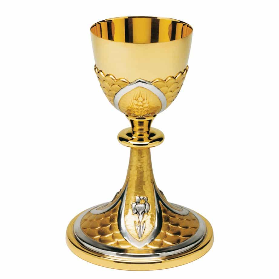 This chiseled chalice is a sacred ornament for Catholic Eucharistic services. It was made of two-tone brass and decorated on the base with representations of embossed lilies. The undercup, on the other hand, bears an ornament with stylized ears of corn. The model proposed in the photograph is for illustrative purposes.