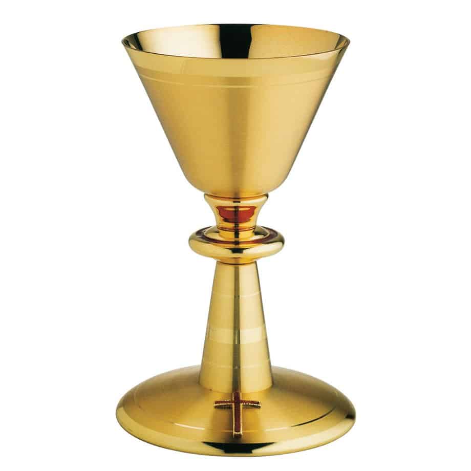 Golden satin brass chalice. Enameled cross on base. Central node enameled.
