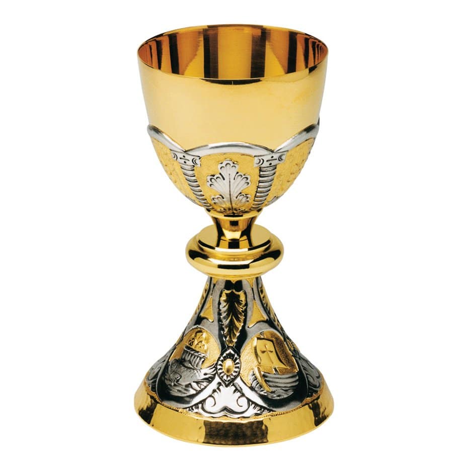 Two-tone brass chalice. Richly chiselled on base and on cup. Symbols on base: bread and fishes, boat, lily,lamb. On cup wheat and leaves.
