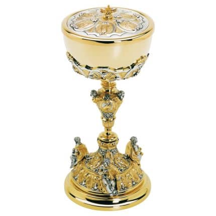 Two-tone chalice with cup made in silver. Investment casting with statues on base representing Faith, Hope and Charity. On base, column and cup symbols referring to the Crucifixion. Cup in silver 800/1,000.