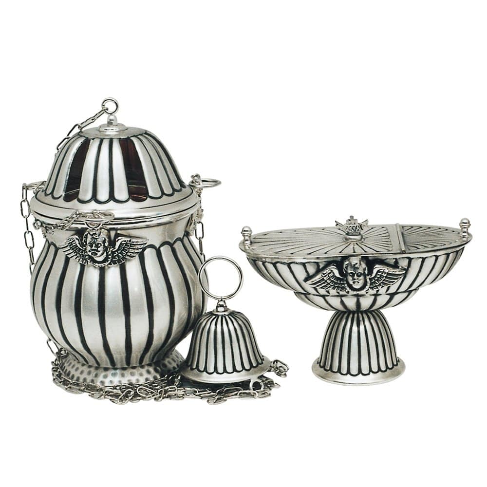 Chiselled brass censer and boat with longitudinal ornaments. The elongated traditional boat is furnished with spoon. The interior is removable.