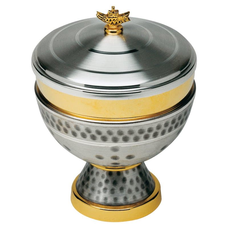 Brass Communion set for Communion under both kinds. Hammered background and embossed crosses. Ciborium furnished with chalice and paten. The interior is removable.
