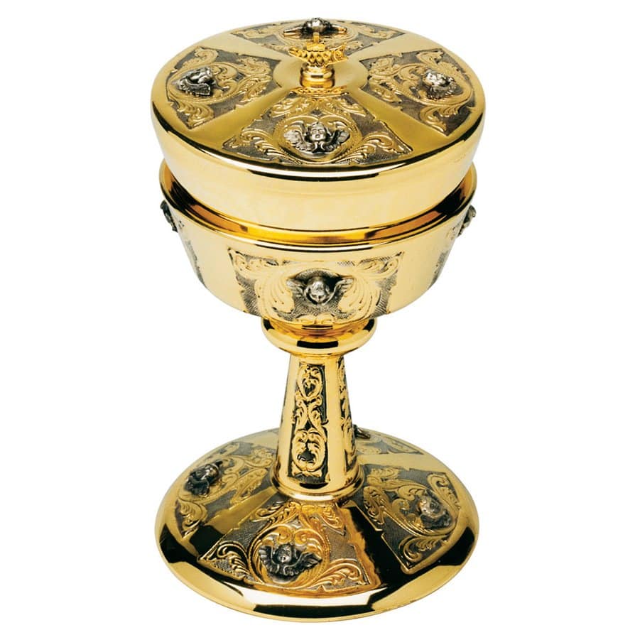 Two-tone chiselled and hand-engraved ciborium with beads of cherubs.