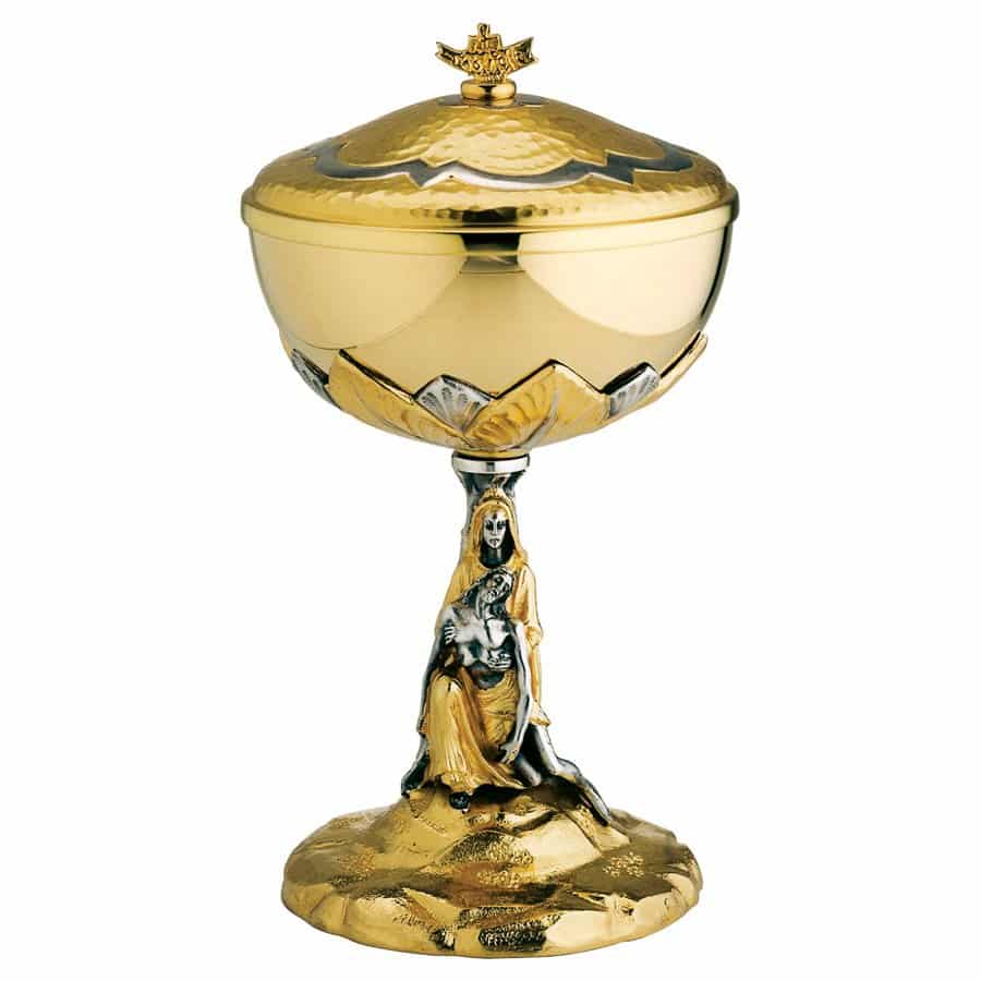 Two-tone ciborium in investment casting featuring the Deposition. Cup and lid finely chiselled.