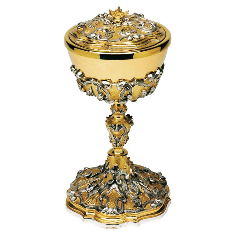 This sacred pyx for the Catholic Mass is made of two-tone brass in lost-wax casting. The foot is ornamented with depictions of miracles. The model proposed in the photograph is for illustrative purposes. All sacred furnishings are designed and produced in our artisan workshop. It is possible to make changes to the proposed workmanship and decorations or to develop entirely new designs based on the Client’s preferences and wishes.