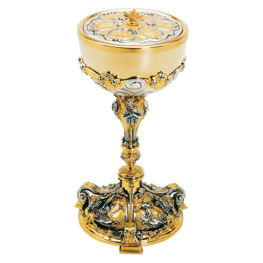 Two-tone ciborium in investment casting representing Annunciation, Crucifixion and Nativity. Angels on column and cherubs on cup, lid adorned with wheat.