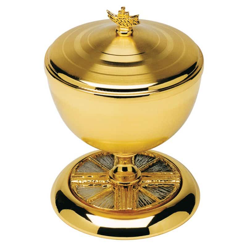 Two-tone brass ciborium. On base golden sunburst cross on silvered background.