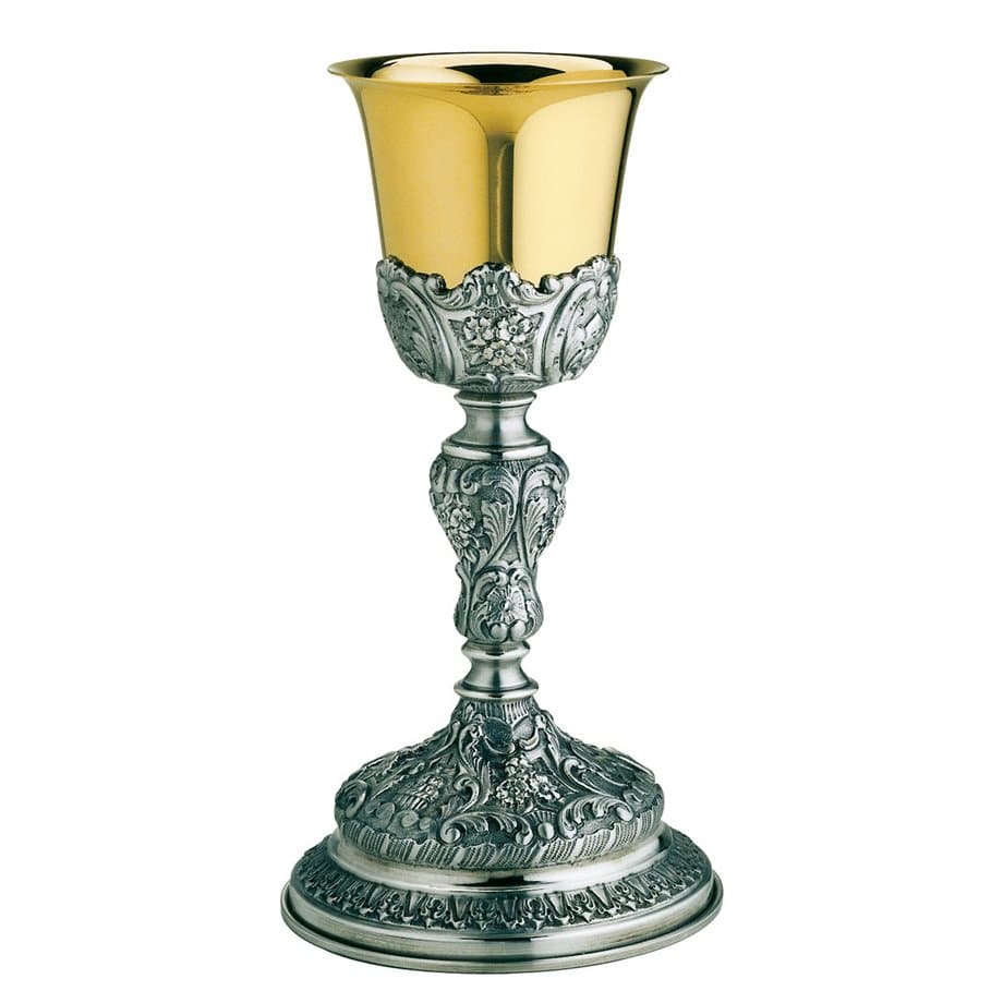 Silvered chiselled brass chalice, Cup in silver. On base flowers and religious symbols: Tables of the Law, bread basket, lamb. Column with flowers. Cup with flowers and symbols: Pax, triangle with the Eye of God, IHS. Cup in silver 800/1,000.