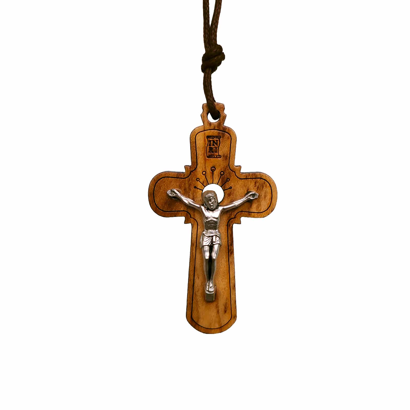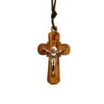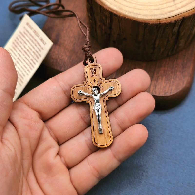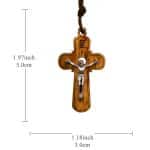 十字架-橄榄木-圆形合金圣尸-带挂绳带卡片带包装-5x3cm