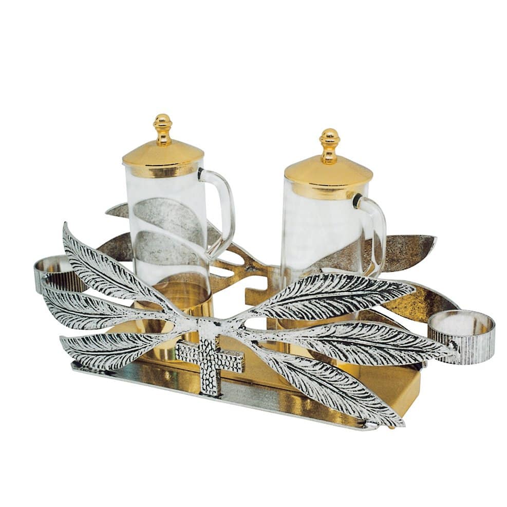 Two-tone brass cruet. Silvered leaves with cross. Cylindrical glasses with integrated handle.