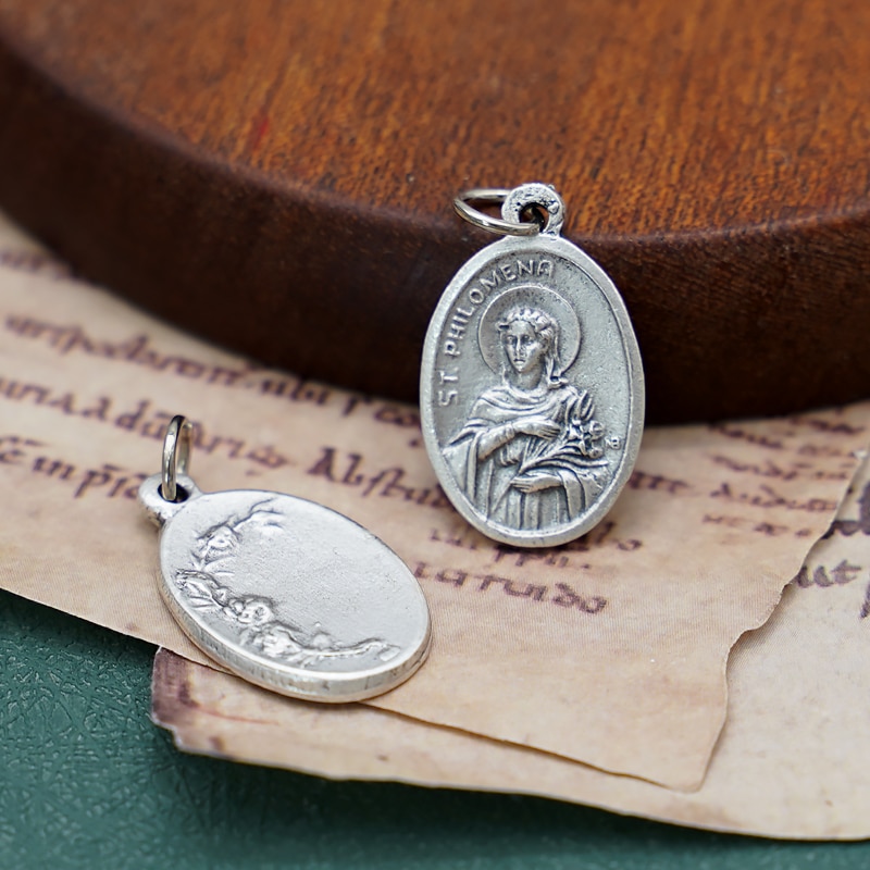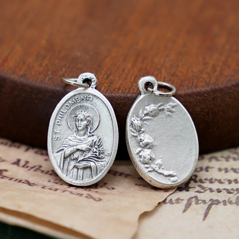 DIY小吊牌-圣女菲洛美娜+玫瑰花-锌合金-镀银-2.2cm