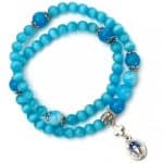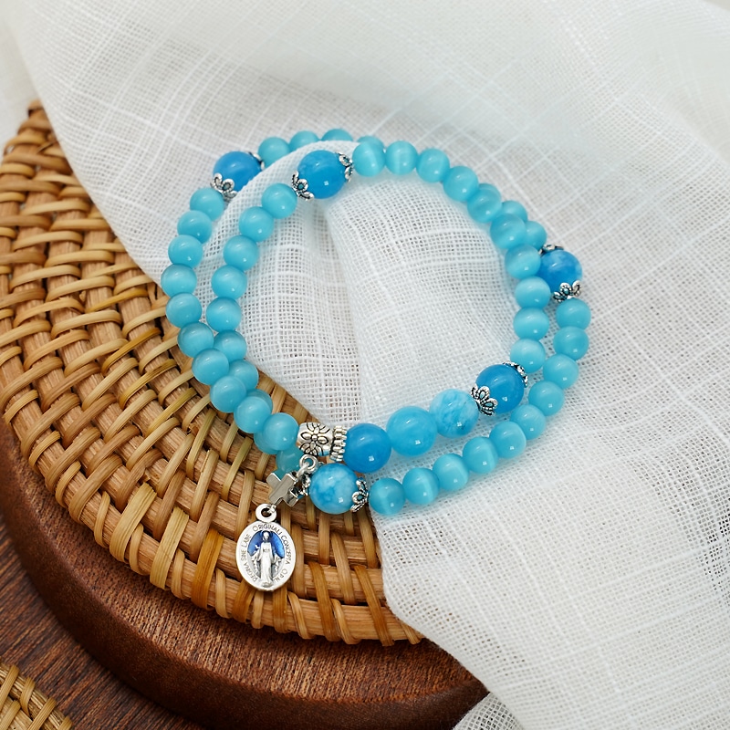 Handmade by nuns in Italy, this colorful cat’s eye string elastic bracelet rosary features a Miraculous medal and crucifix, making it a perfect devotional or fashion accessory.