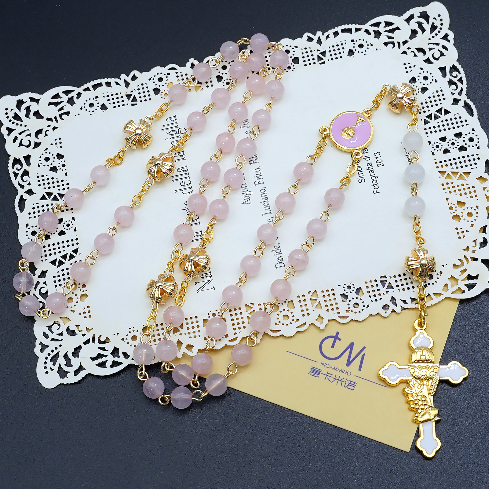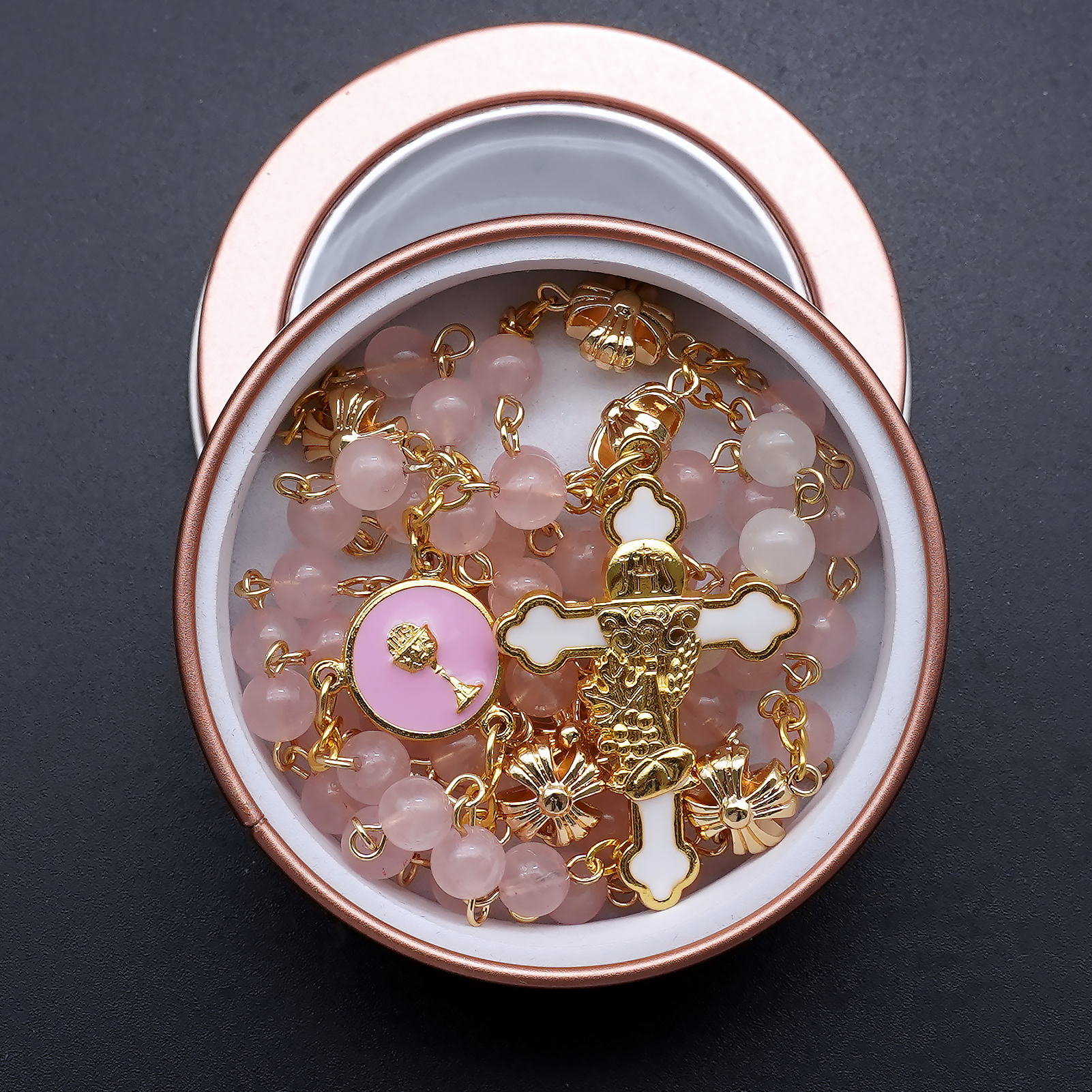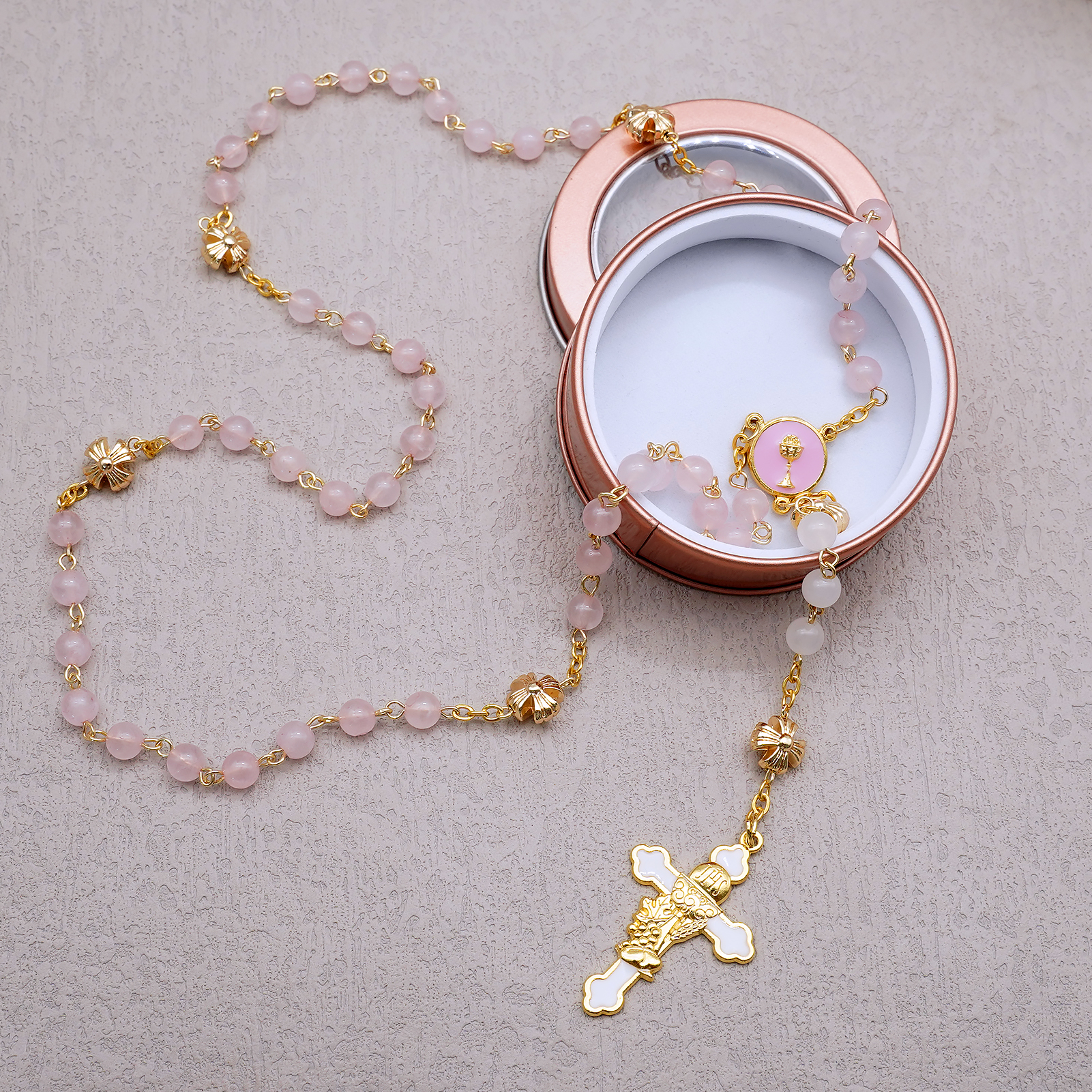 玫瑰念珠-初领圣体-粉水晶配白玉髓-6mm