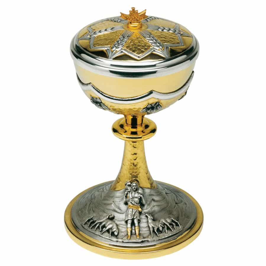 Two-tone chiselled ciborium with beads on base, representing the Good Shepherd with lambs. Cup adorned with lilies.