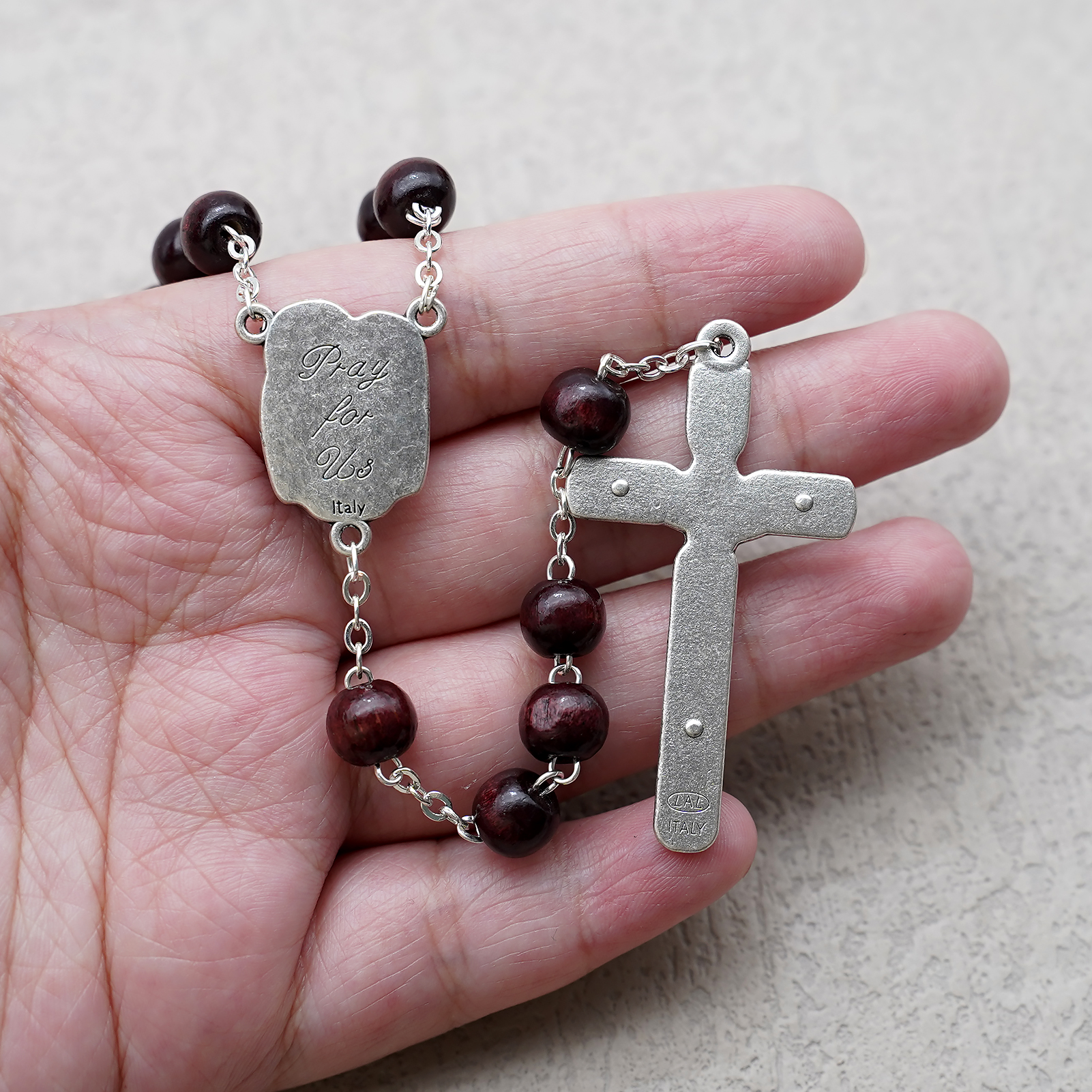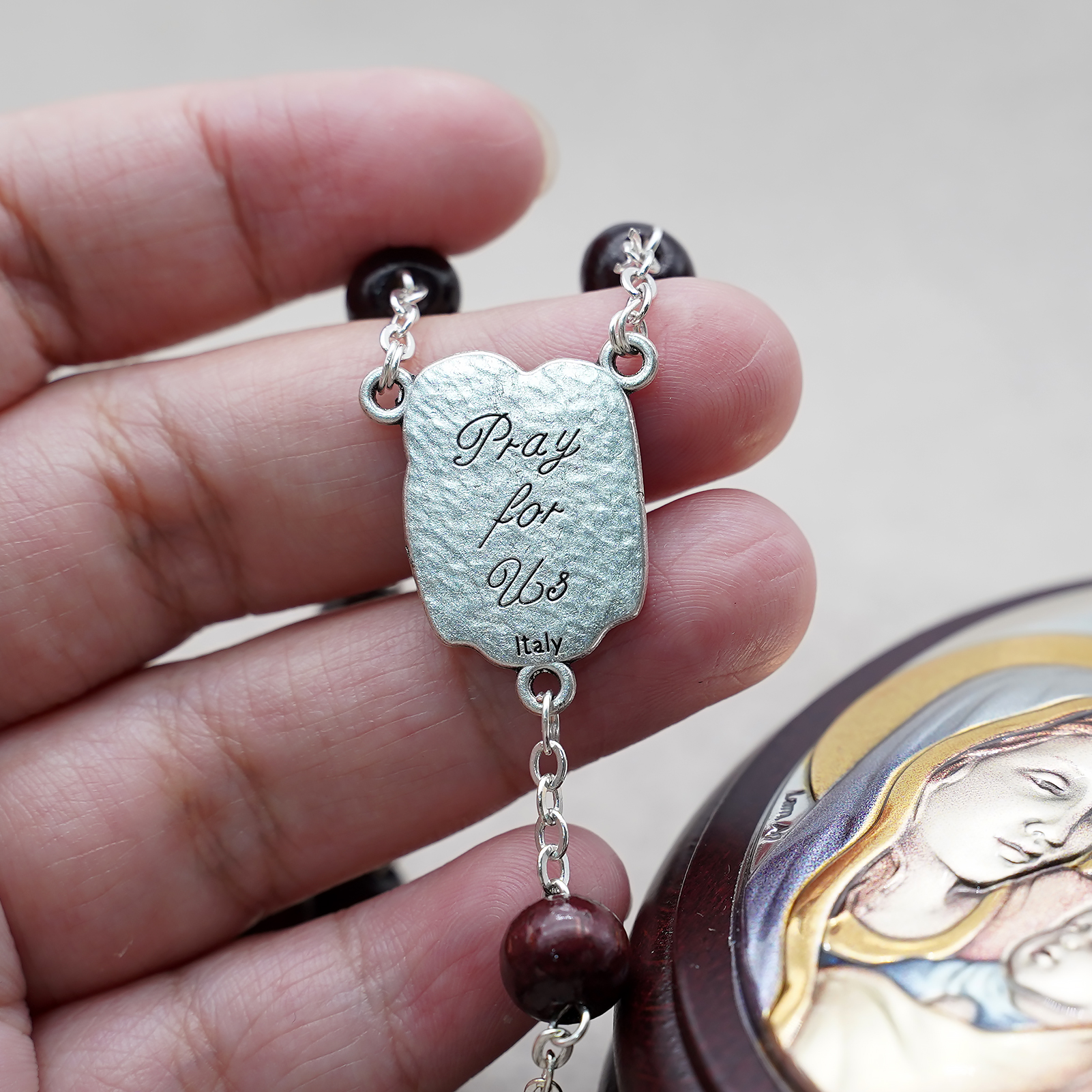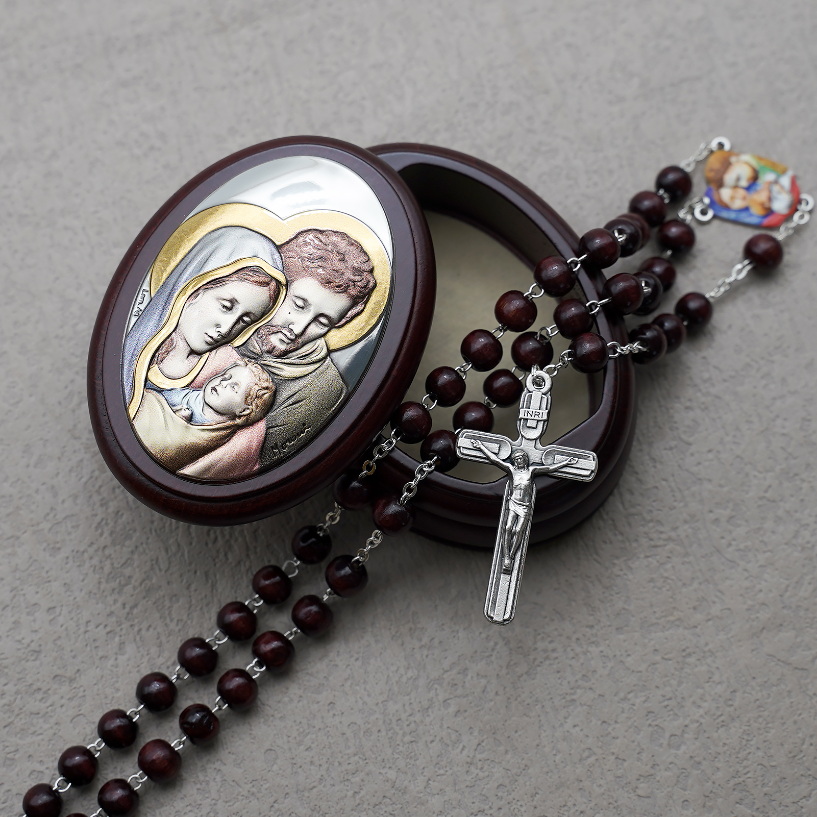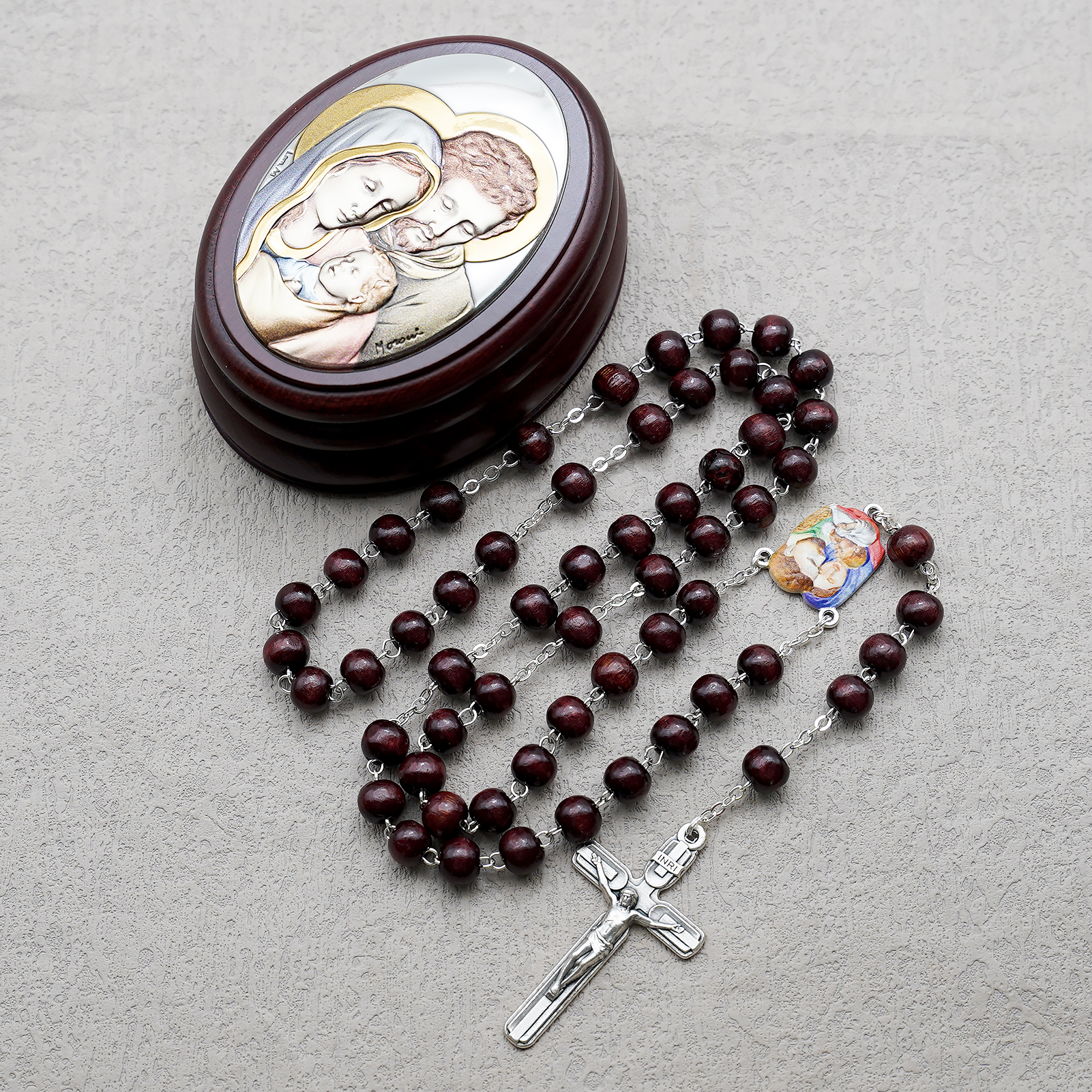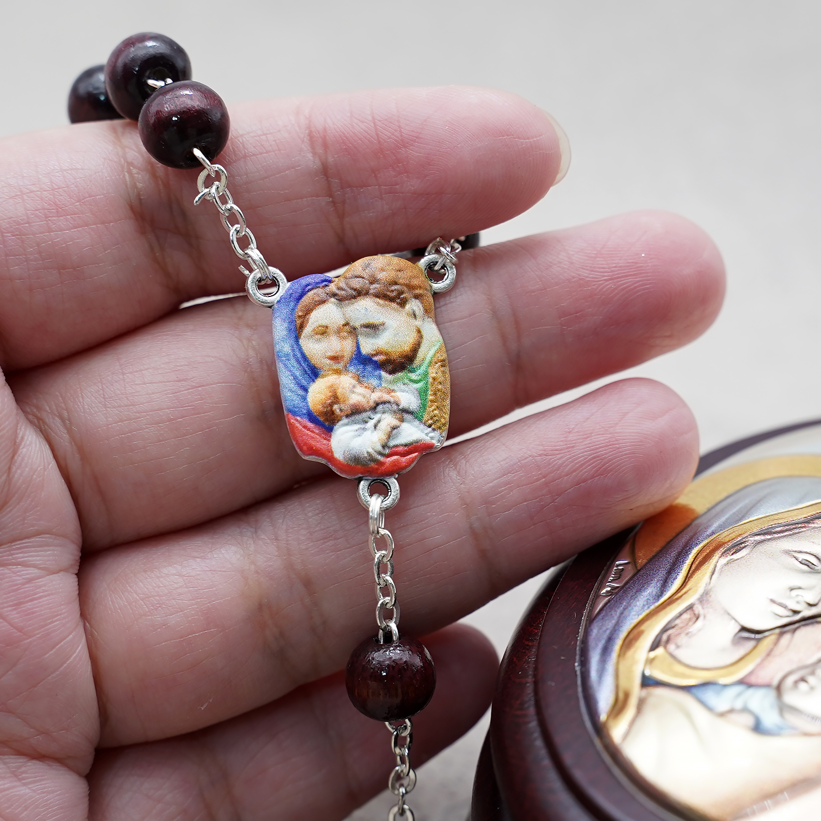 玫瑰念珠-紫檀套装-圣家-彩色-925银浮雕像-带盒