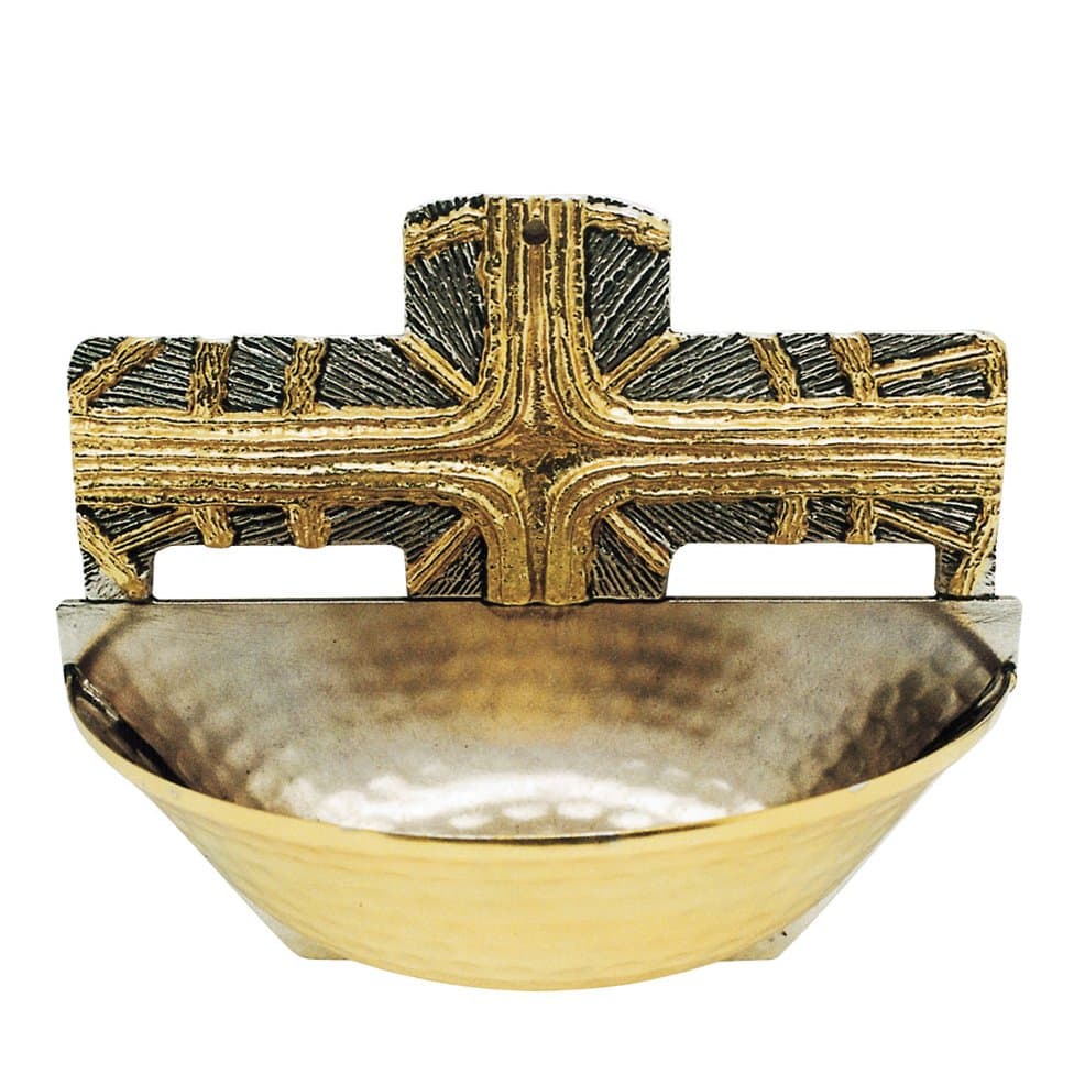 Two-tone brass holy water font with golden sunburst Cross on silvered background. It is furnished with plastic basin.