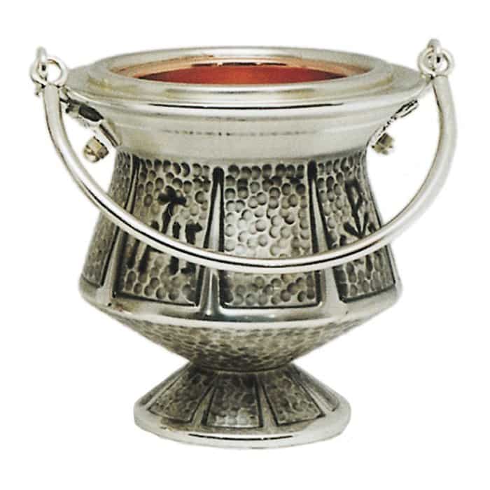 Holy water pot in chiselled by hand brass with hammering and symbols Pax and IHS: extractable inside.