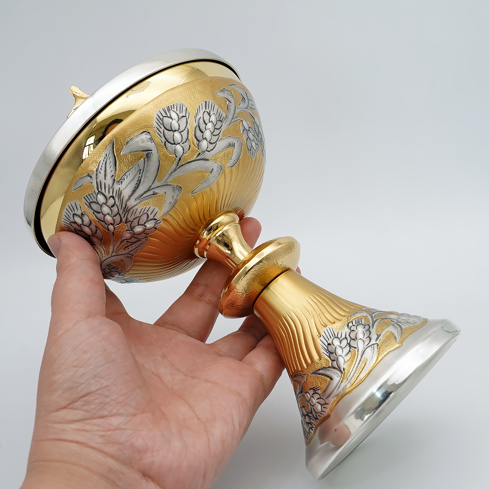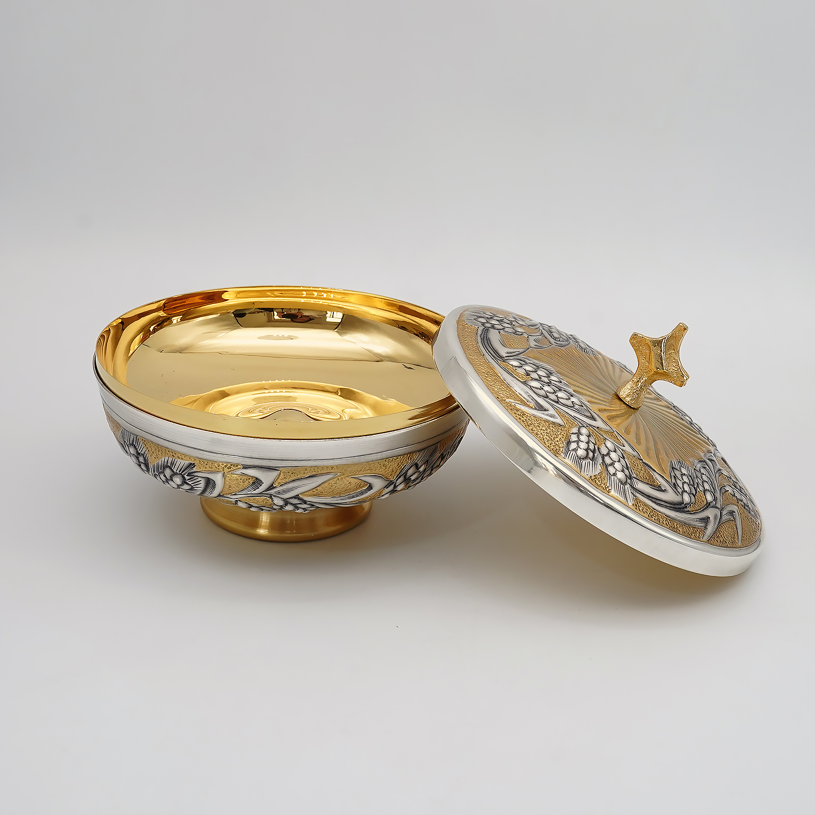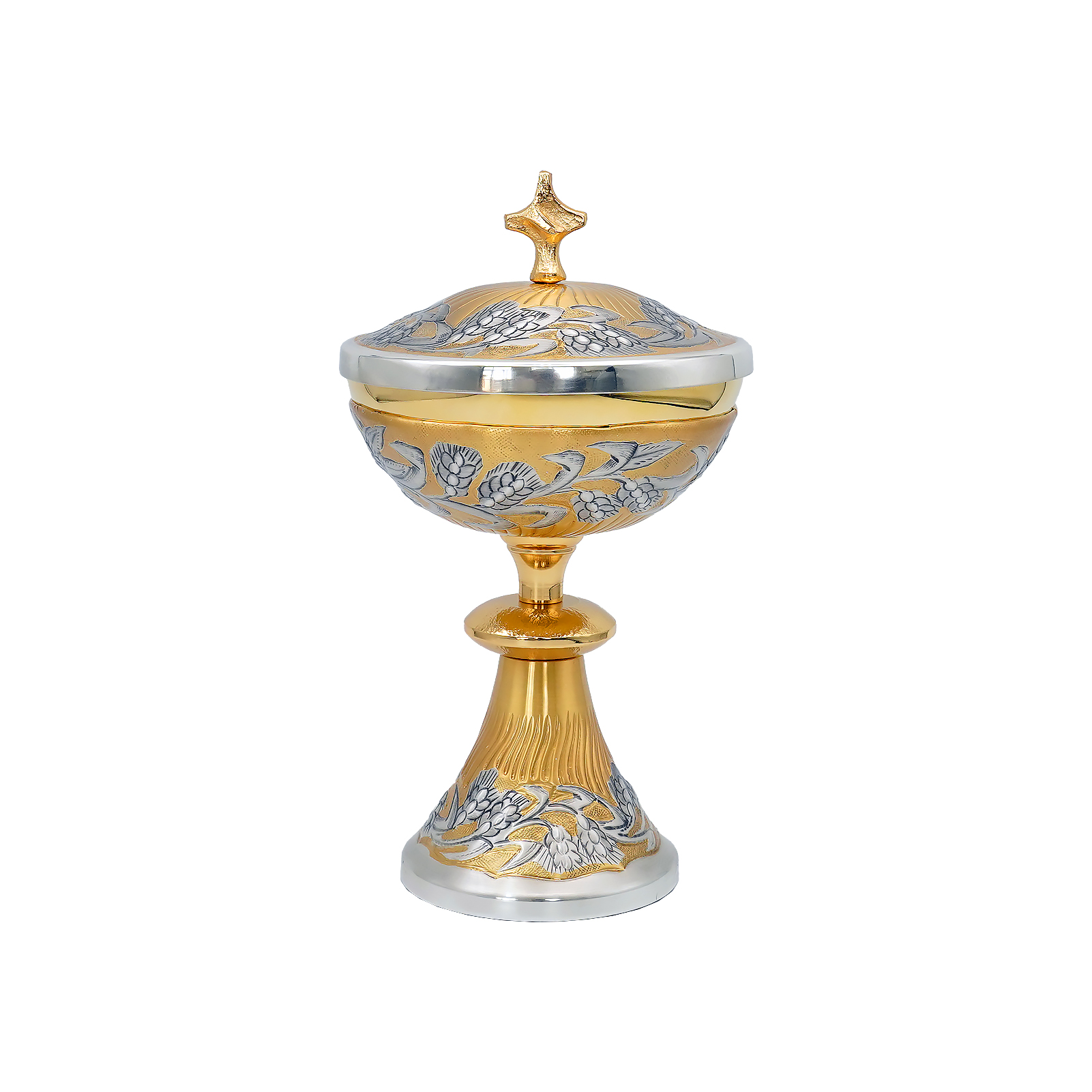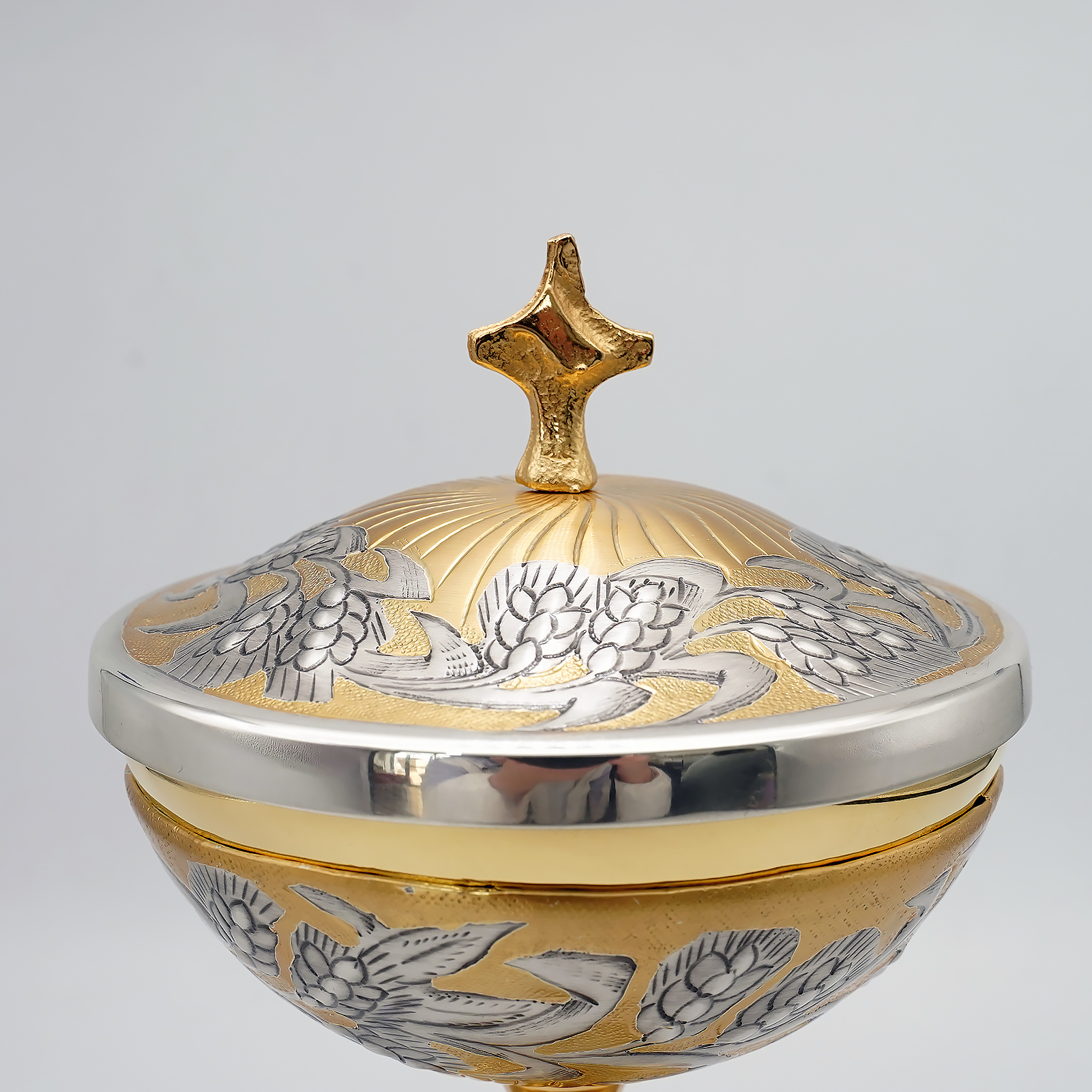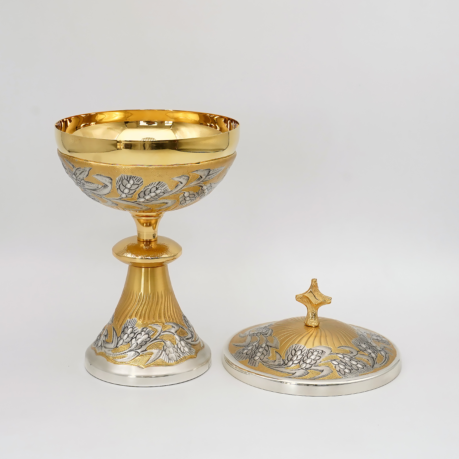 【现货】鱼与麦穗图案-手工雕刻-银色-圣爵杯圣体盒圣体碗带盖套装24+18+10.5cm