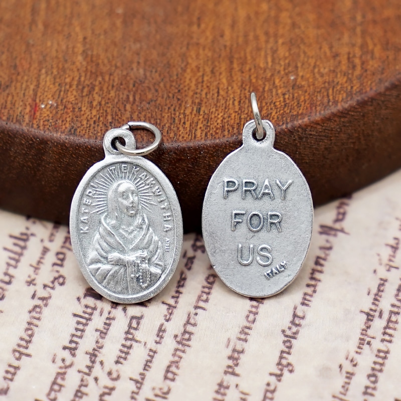 Kateri Tekakwitha Catholic medal, alloy silver-plated, 2.2 cm high, ideal for DIY rosary accessories.