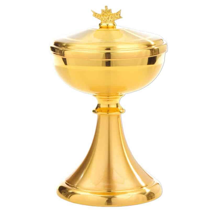 This catholic Ciboria for the moment of the Holy Communion in the liturgical ritual is totally realized in gilded brass. His smooth surface and the lack of decorations and embellisshments make this Ciboria very plain. Particular in this Holy Communion Ciboria is the stripe with a glossy gilded satin finish in the upper part, in contrast with base and lid.