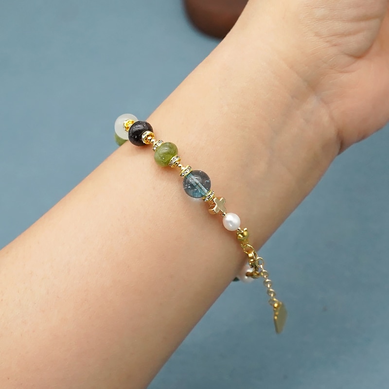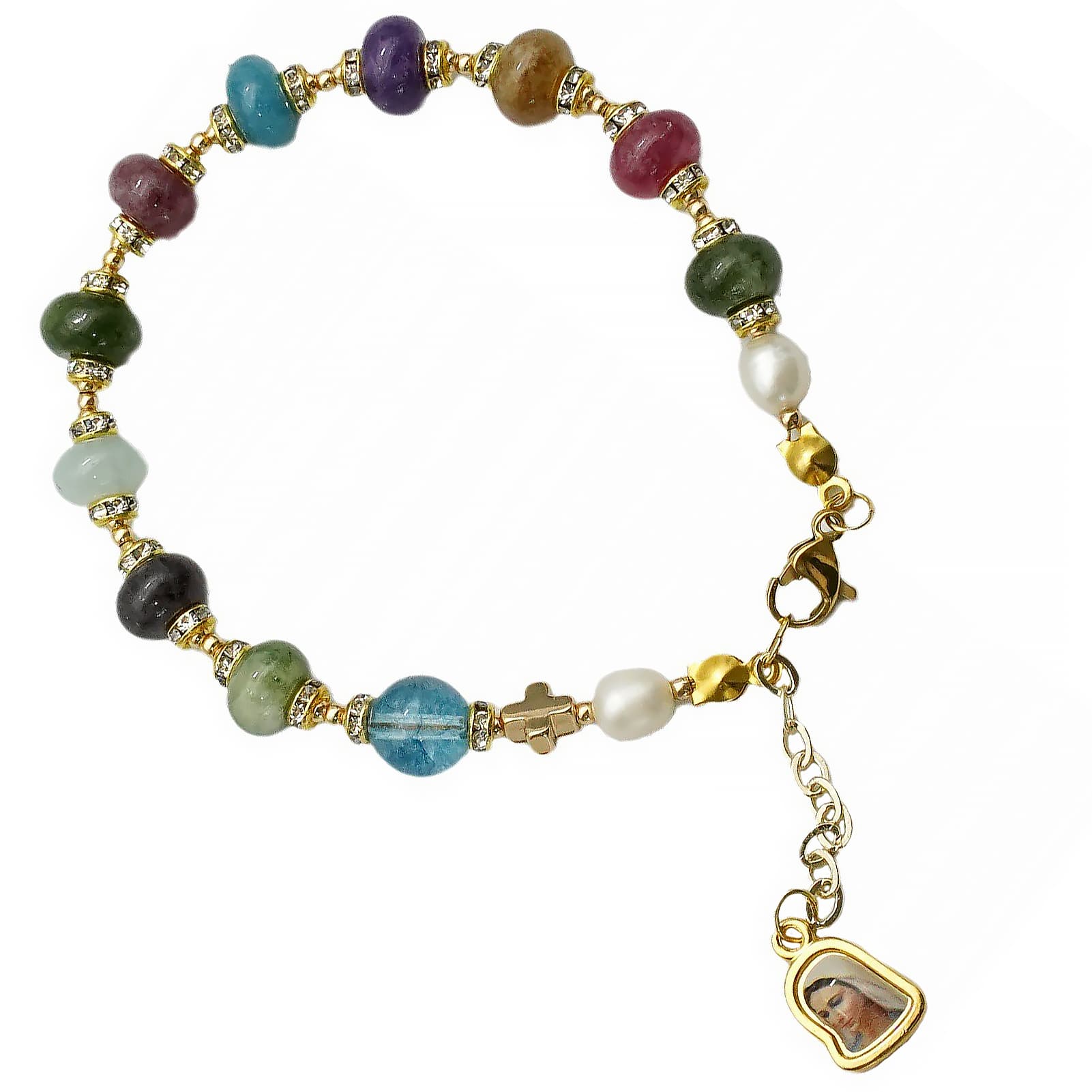 龙虾扣手链-车轮珠彩色碧玺-默主哥耶吊坠-5x8mm