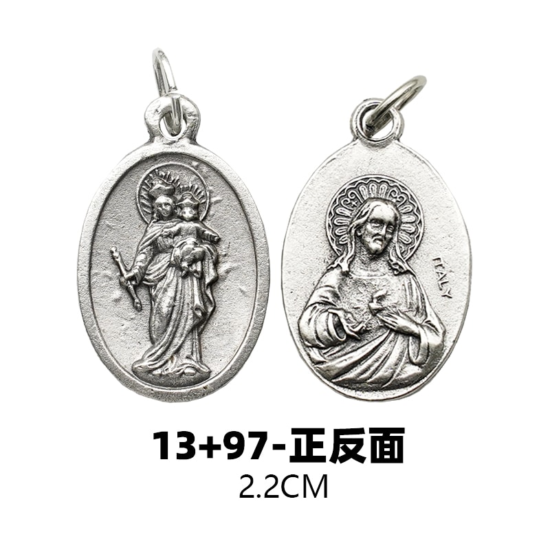 This Mary Help of Christians and Sacred Heart of Jesus Catholic medal is a beautiful DIY accessory for crafting your own rosary. Made of silver-plated zinc alloy, it measures 2.2 cm high and features intricate detailing. This religious medal is a symbol of faith and devotion, making it a perfect addition to any religious jewelry or rosary collection.