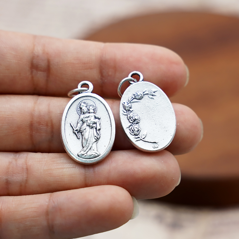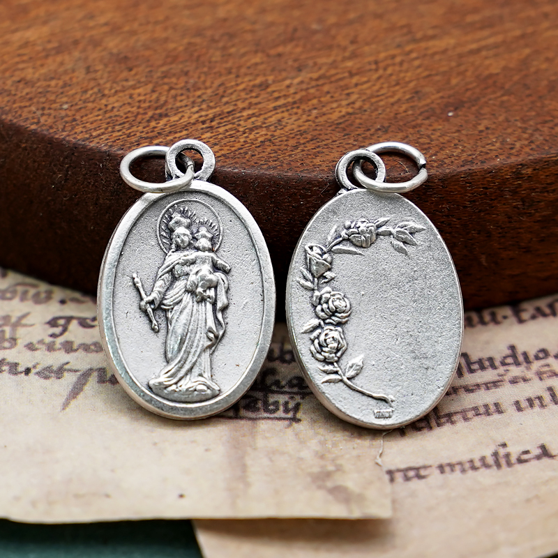 Mary Help of Christians Catholic medal, 2.2 cm high, alloy silver-plated, perfect for rosary DIY projects or as a personal pendant for devotion.