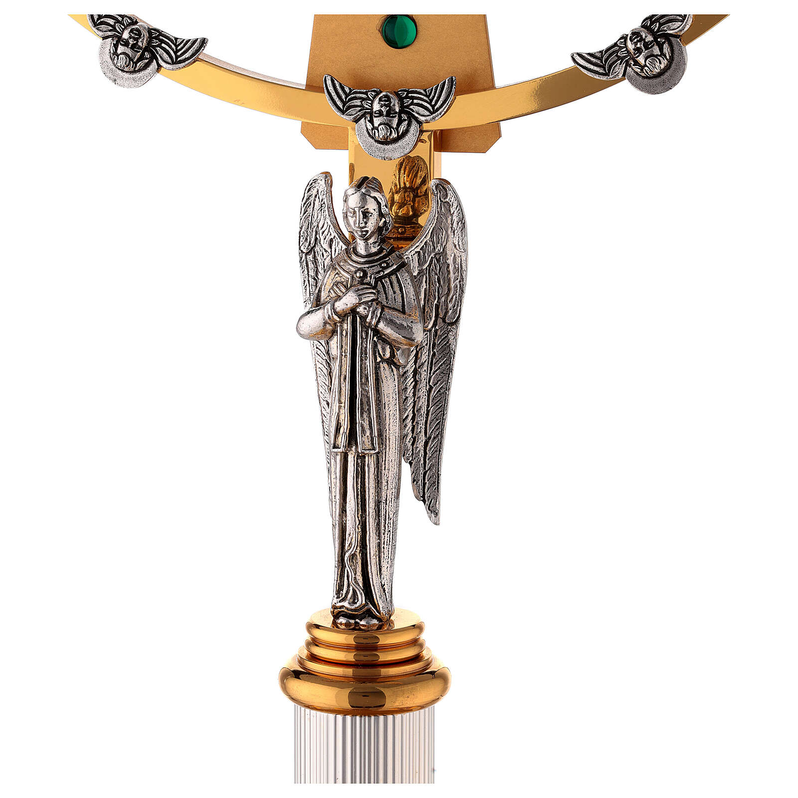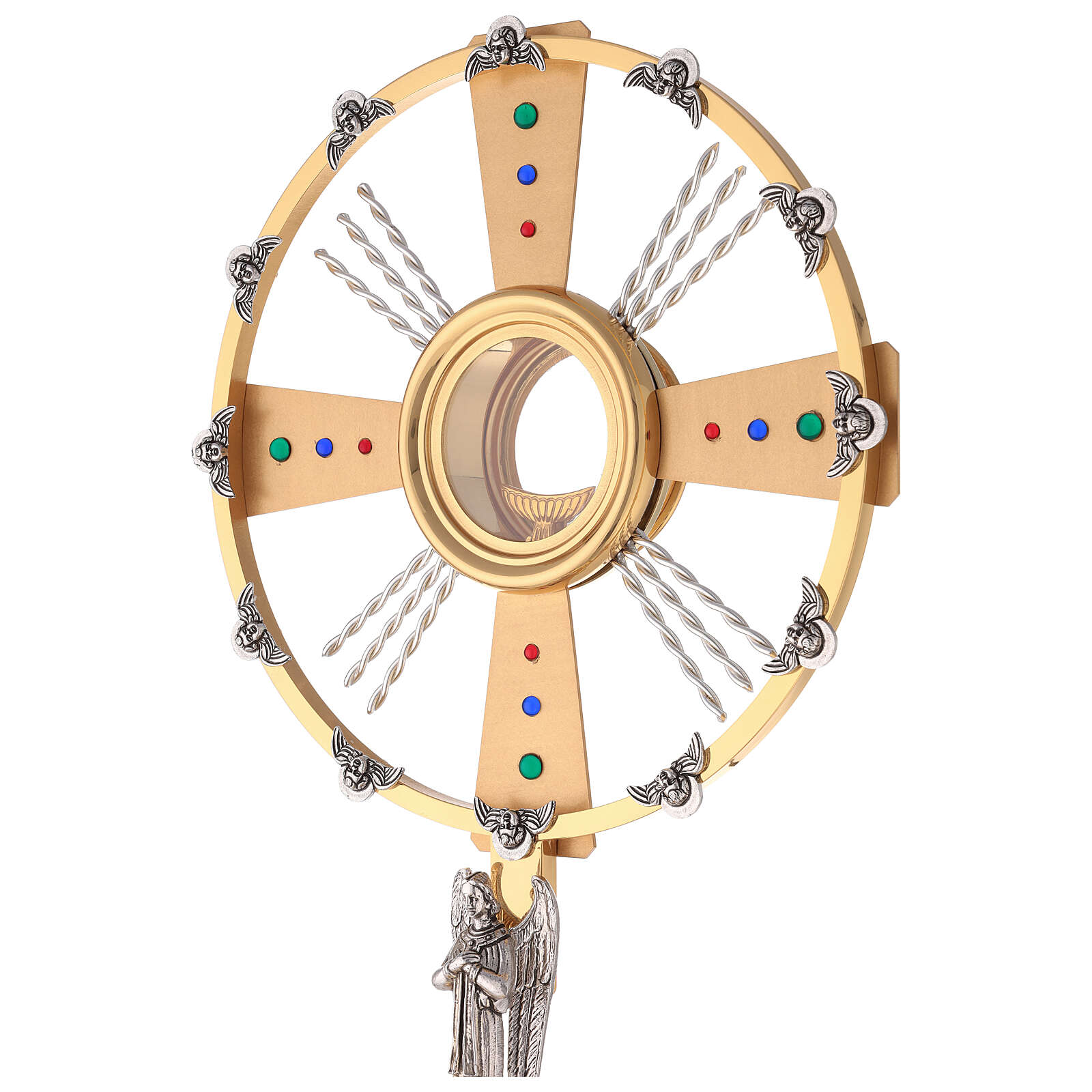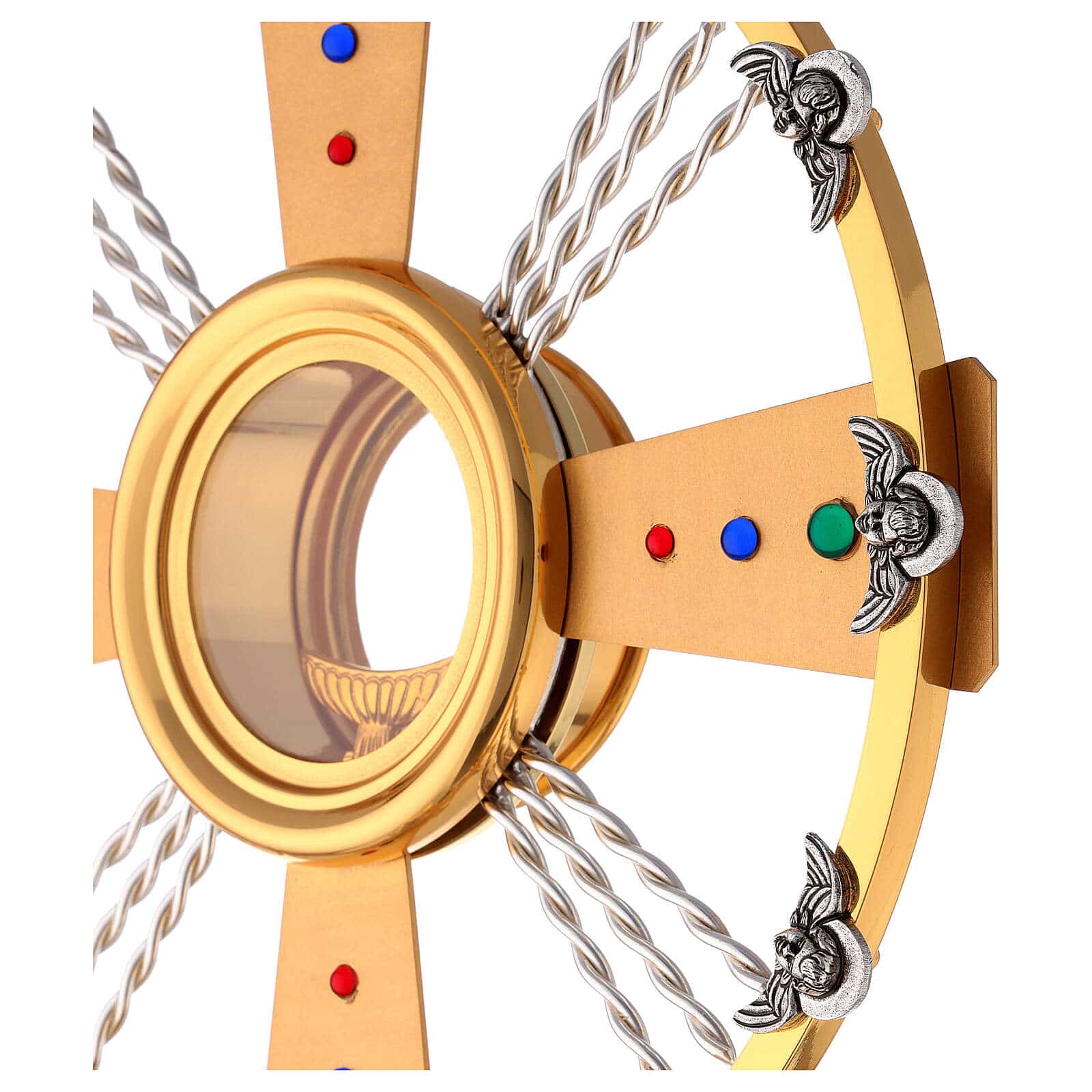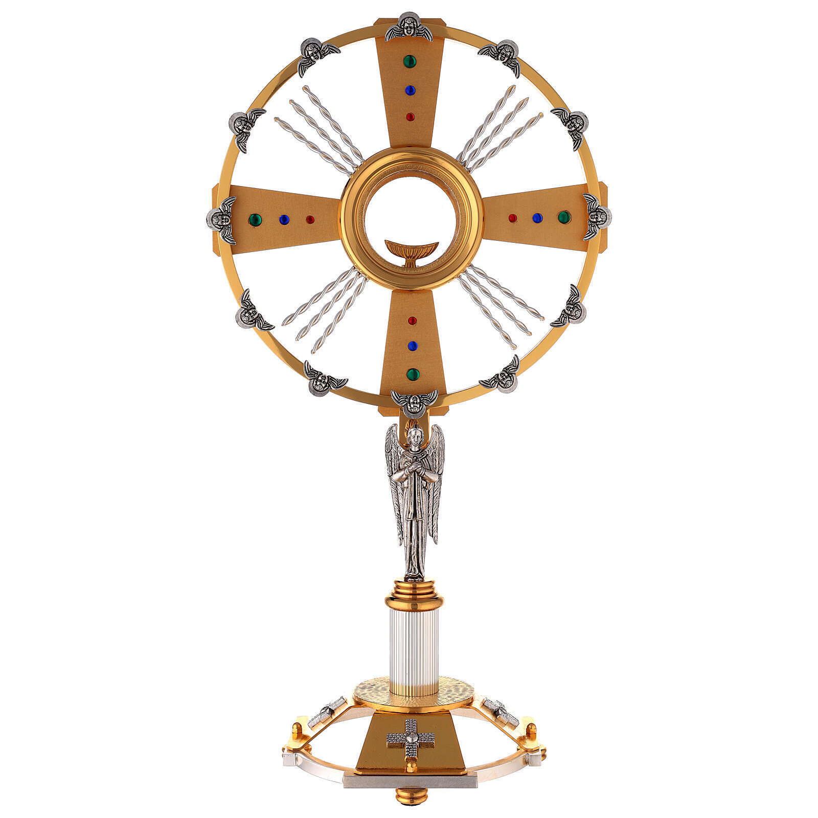 Monstrance two-toned with blue, red and green stones handmade, 60 cm.Two-tone Catholic monstrance in brass and silvered bronze, embellished with red, blue and green stones.It has a host holder (luna) in the center with a diameter of 9 cm.Handcrafted product made entirely in Italy, of high value and quality.
