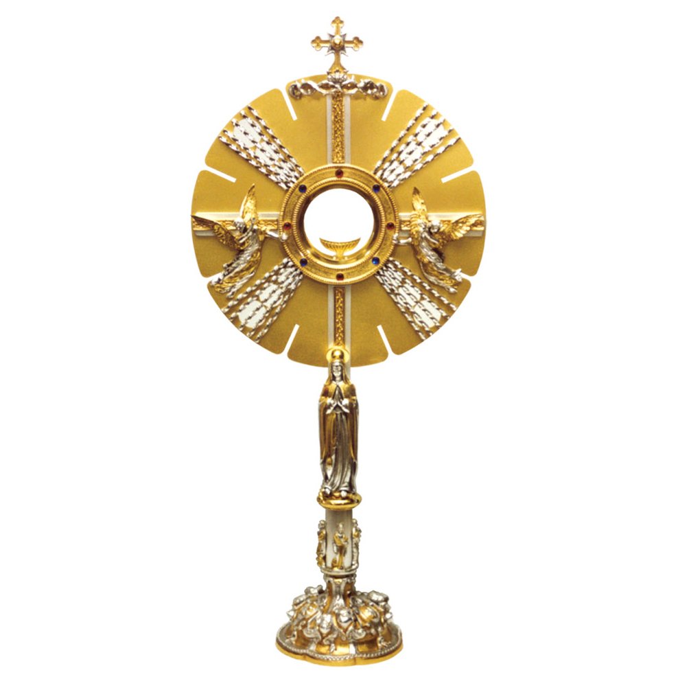 Richly wrought two-tone brass ostensorium. Leg with angels, column with symbols of the four Evangelists and a statuette of Virgin Mary. Rays decorated with angels.