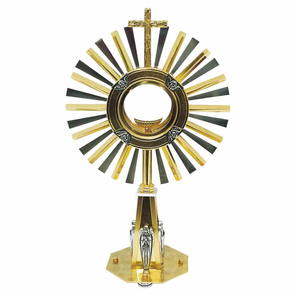 Two-tone brass ostensorium. A central column with four adoring angels. Four cherubs encircle luna housing.