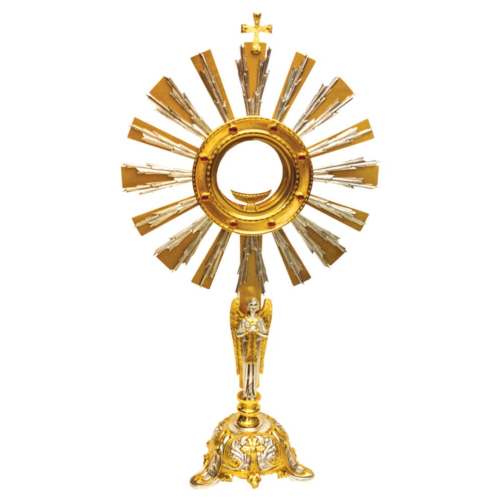 Two-tone brass ostensorium, leg with cross. Column with adoring angel, with red stones encircle luna housing.