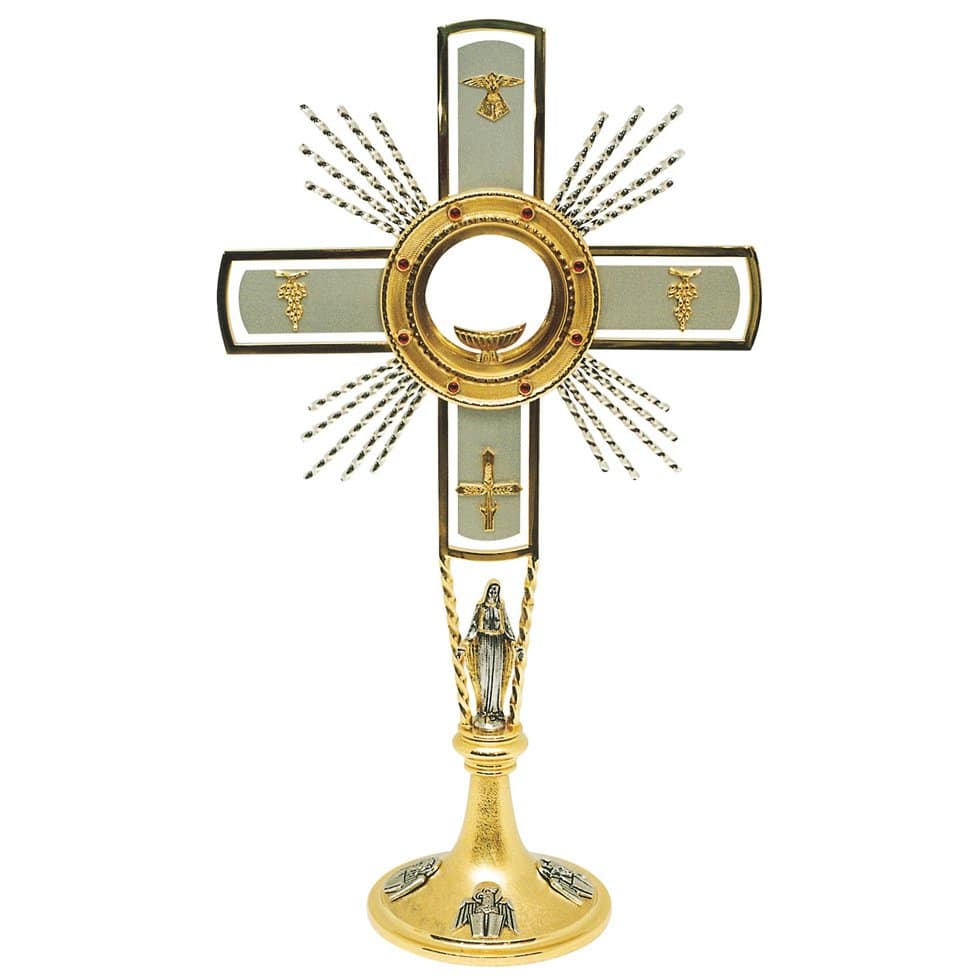 Two-tone brass ostensorium. On leg symbols of the four Evangelists, a statuette of the Virgin Mary on the central part. Rays adorned with grapes, wheat, and dove. Luna is adorned with red stones.