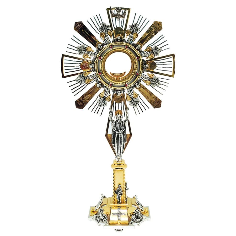 Two-toned ostensorium with small luna. On legs castings with four evangelists and cross symbols. Column with statuettes: Saint Paul, Saint John, Saint Peter. A statue of Christ holds up the luna with grapes and cherubs castings.