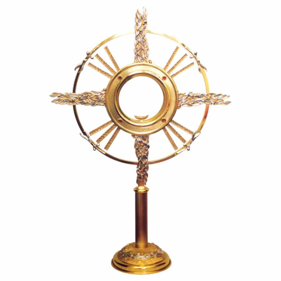 Two-tone brass ostensorium completely decorated with olive trees. Red stones encircle luna housing.