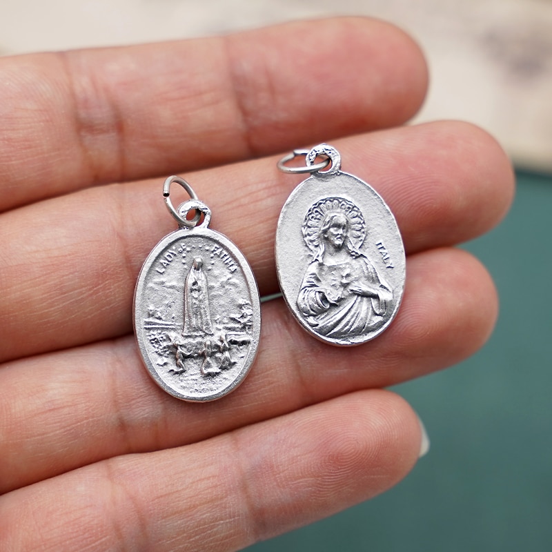 Our Lady of Fatima and Sacred Heart of Jesus pendant, made in Italy, alloy silver plated, 2.2cm size, DIY accessory with Catholic Saints story.