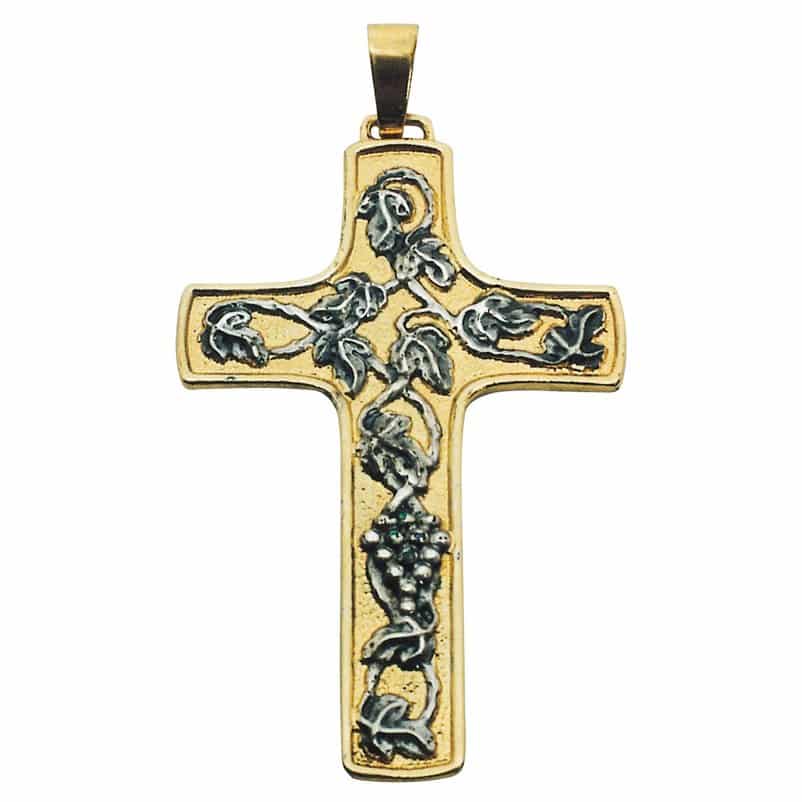 Pectoral cross in two-tone brass furnished with a small chain. Investment casting with vines shoots.