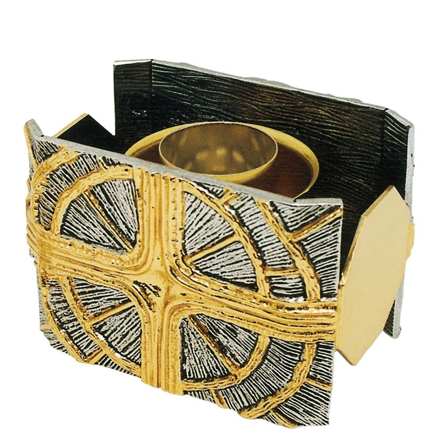 Rectangular two-tone candlestick in brass castings with golden crosses and golden profiles.