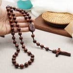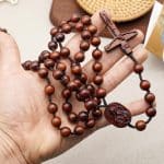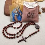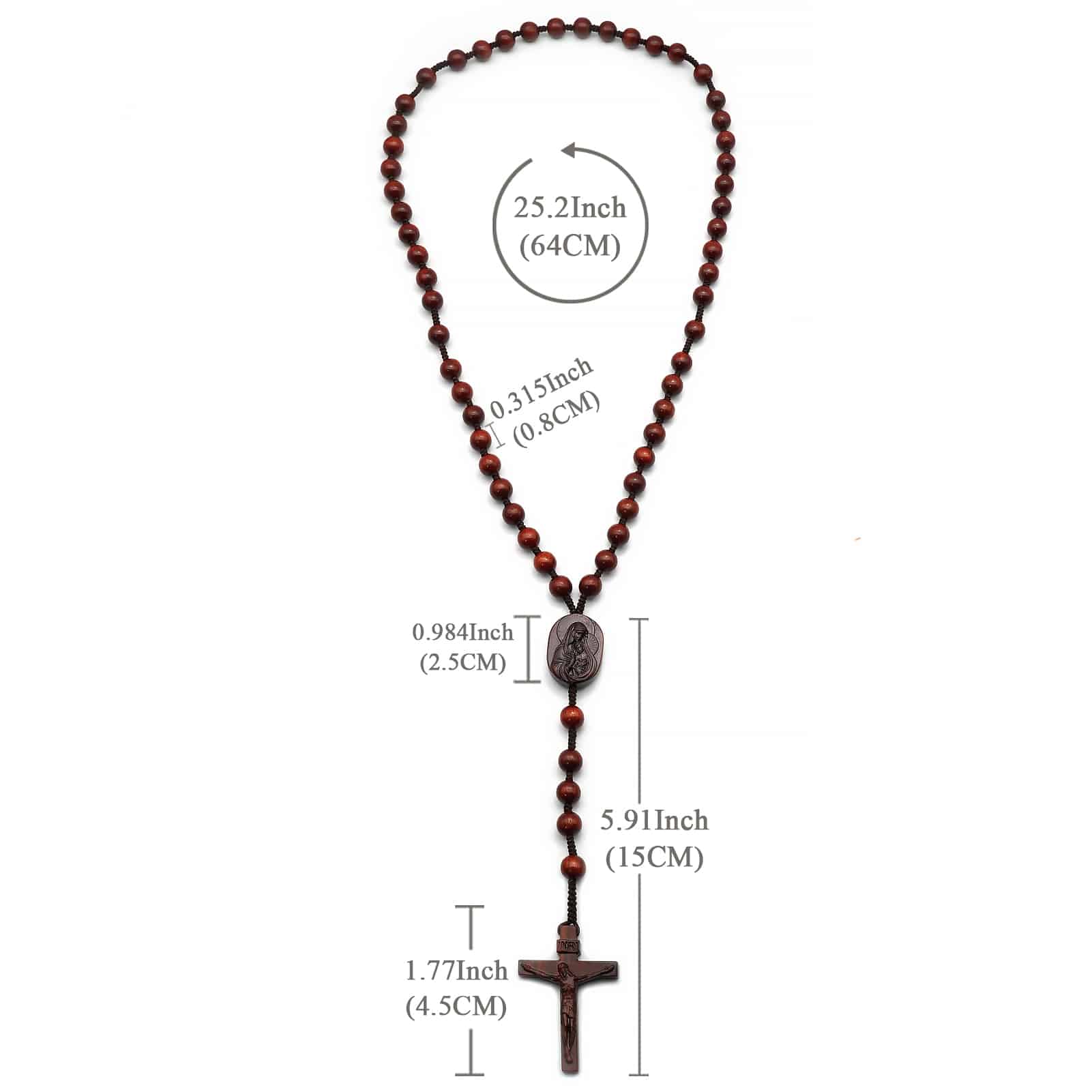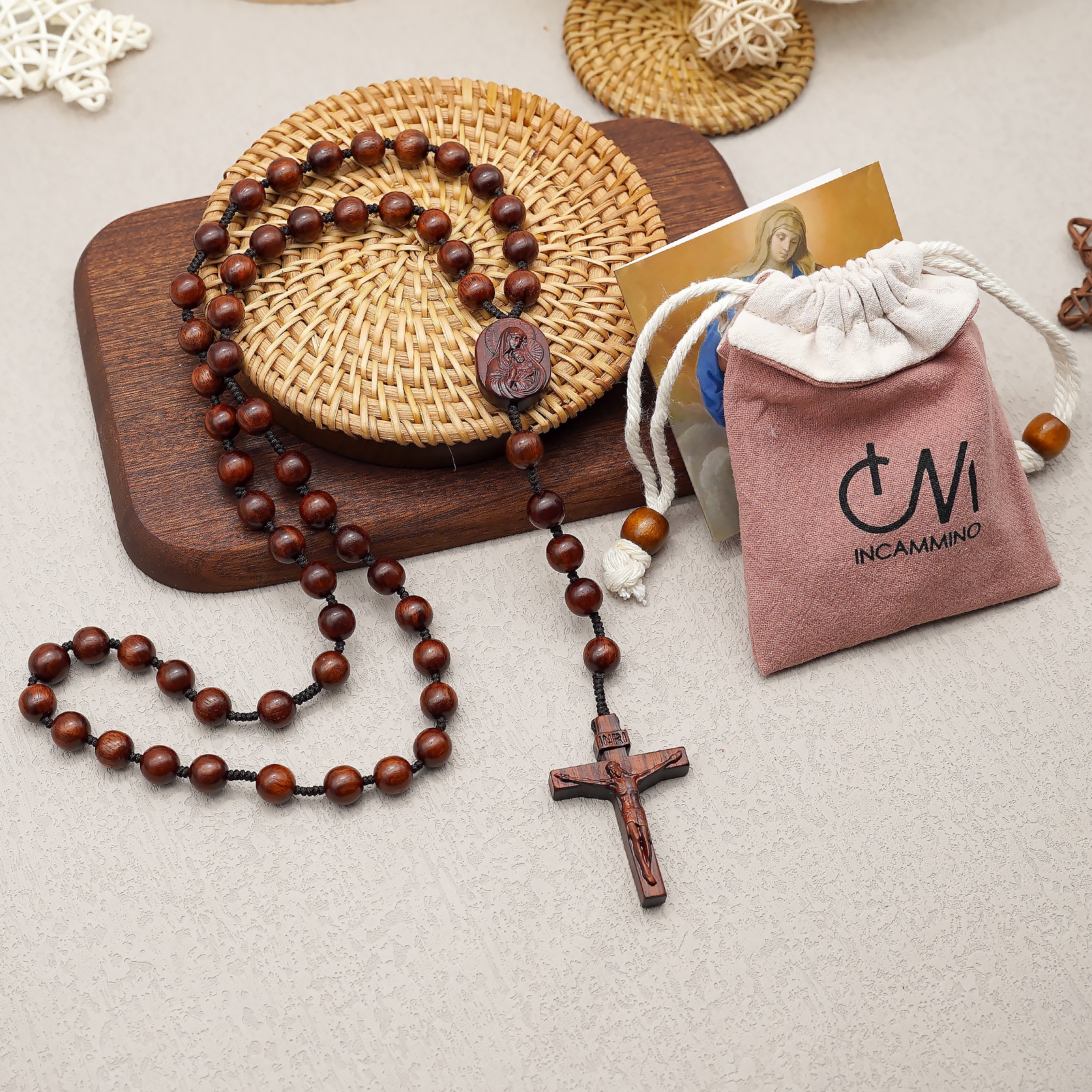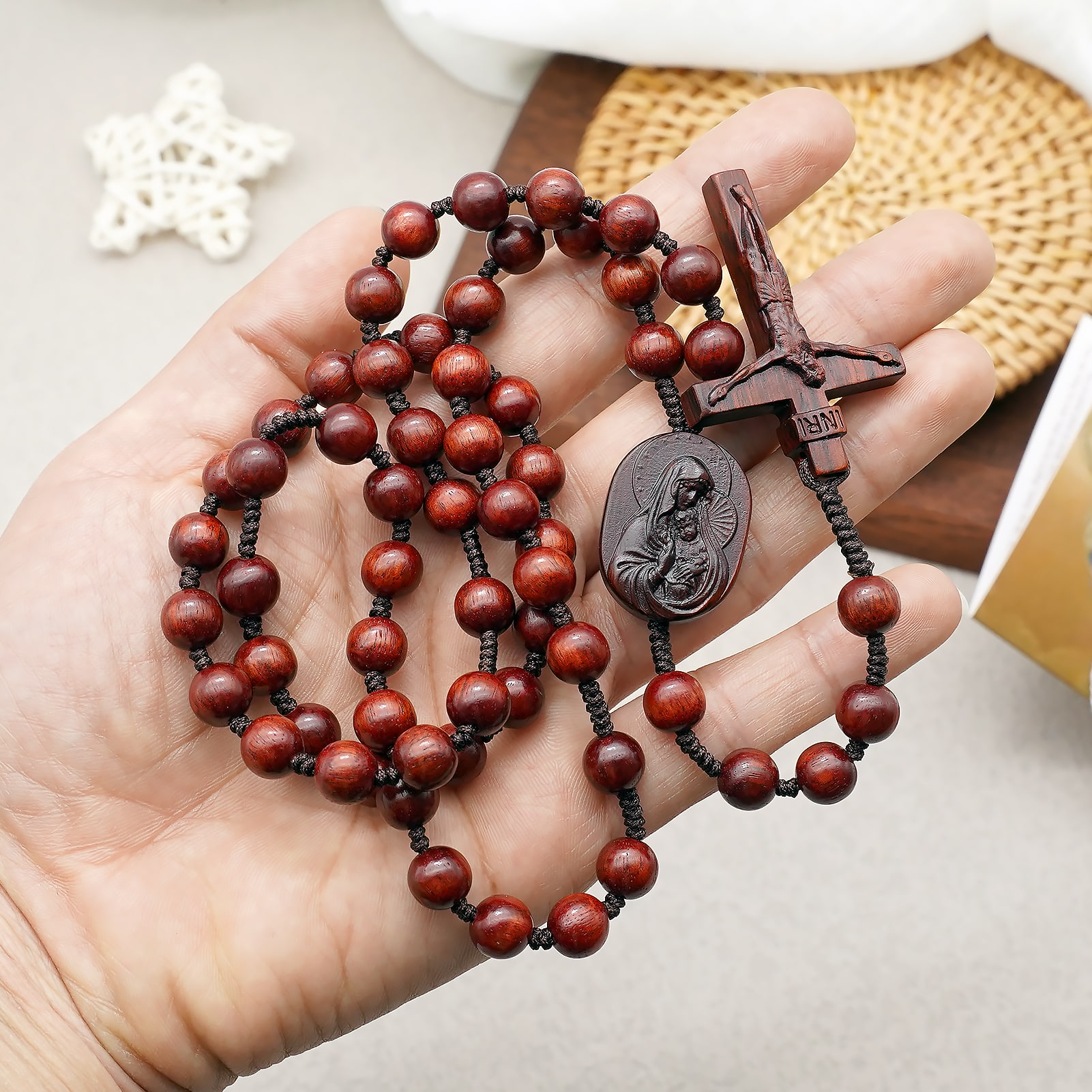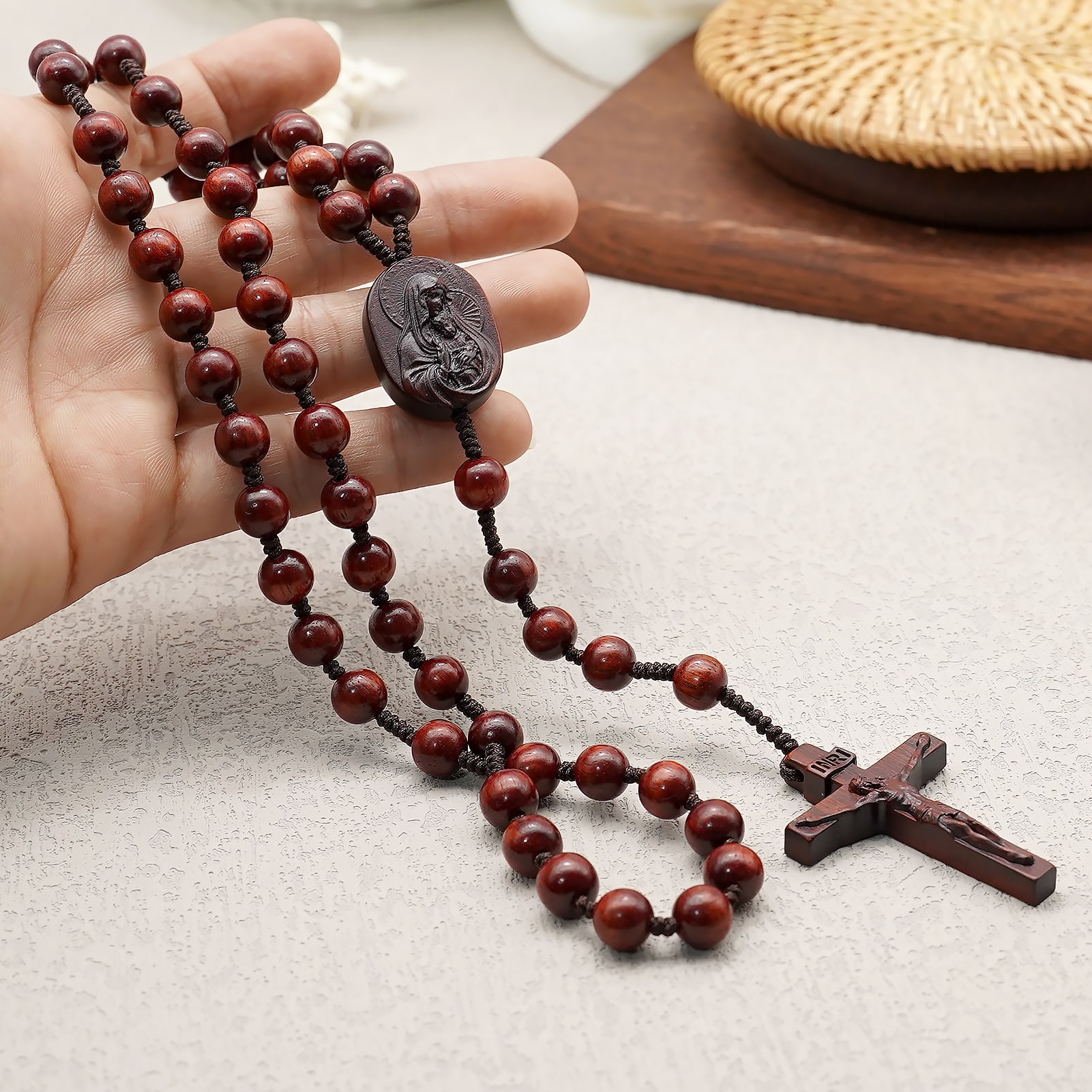 手工制作的檀木念珠,三通是圣母怀抱耶稣的雕像,并点缀中国结元素。坚固耐用,既适合日常使用,亦可作为珍贵纪念品珍藏。