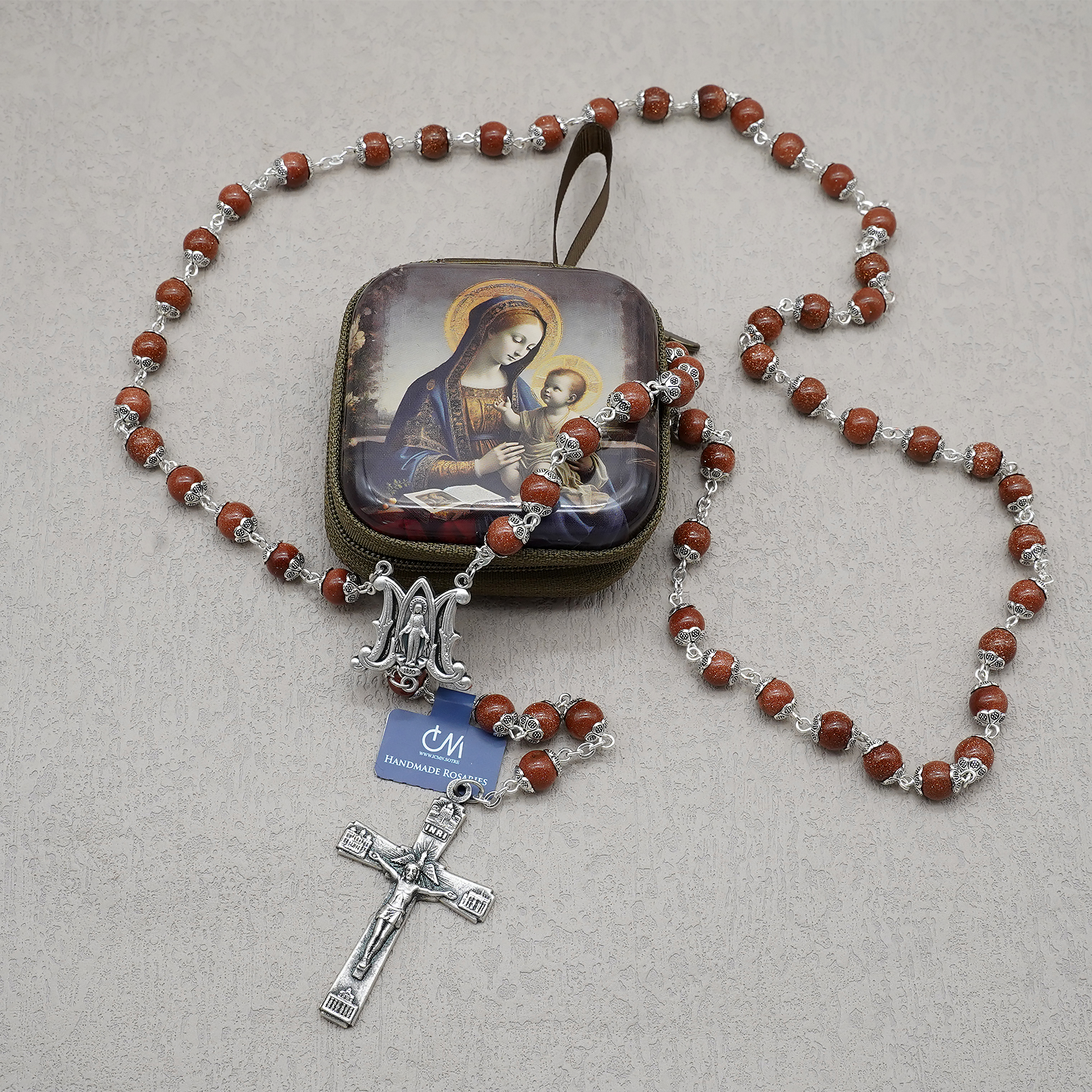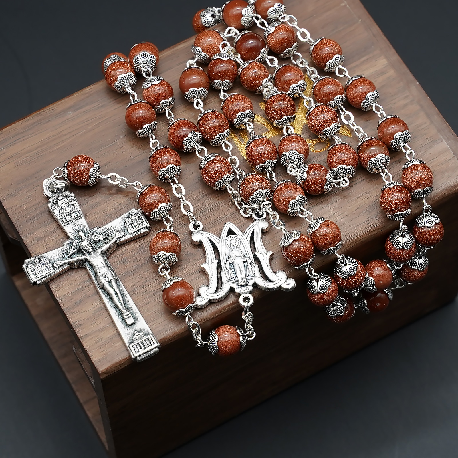 玫瑰念珠-圣母显灵三通-罗马四大殿十字架-金沙石珠-8mm送念珠包