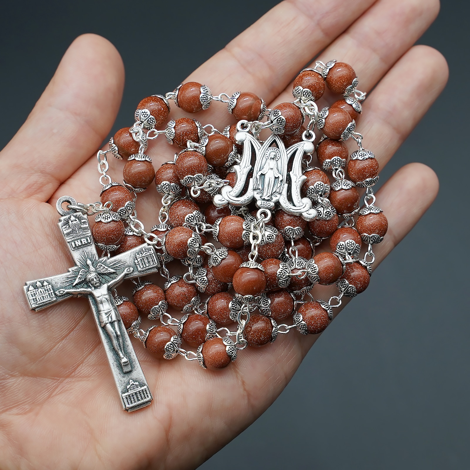 Celebrate Catholic tradition and devotion with this 8mm Goldstone Rosary with Butterfly Miraculous Medal and Roman Major Basilica-Style Crucifix. The rosary features 8mm (approximately 0.31 inches) shimmering goldstone beads, each adorned with floral caps that add a touch of elegance and beauty.