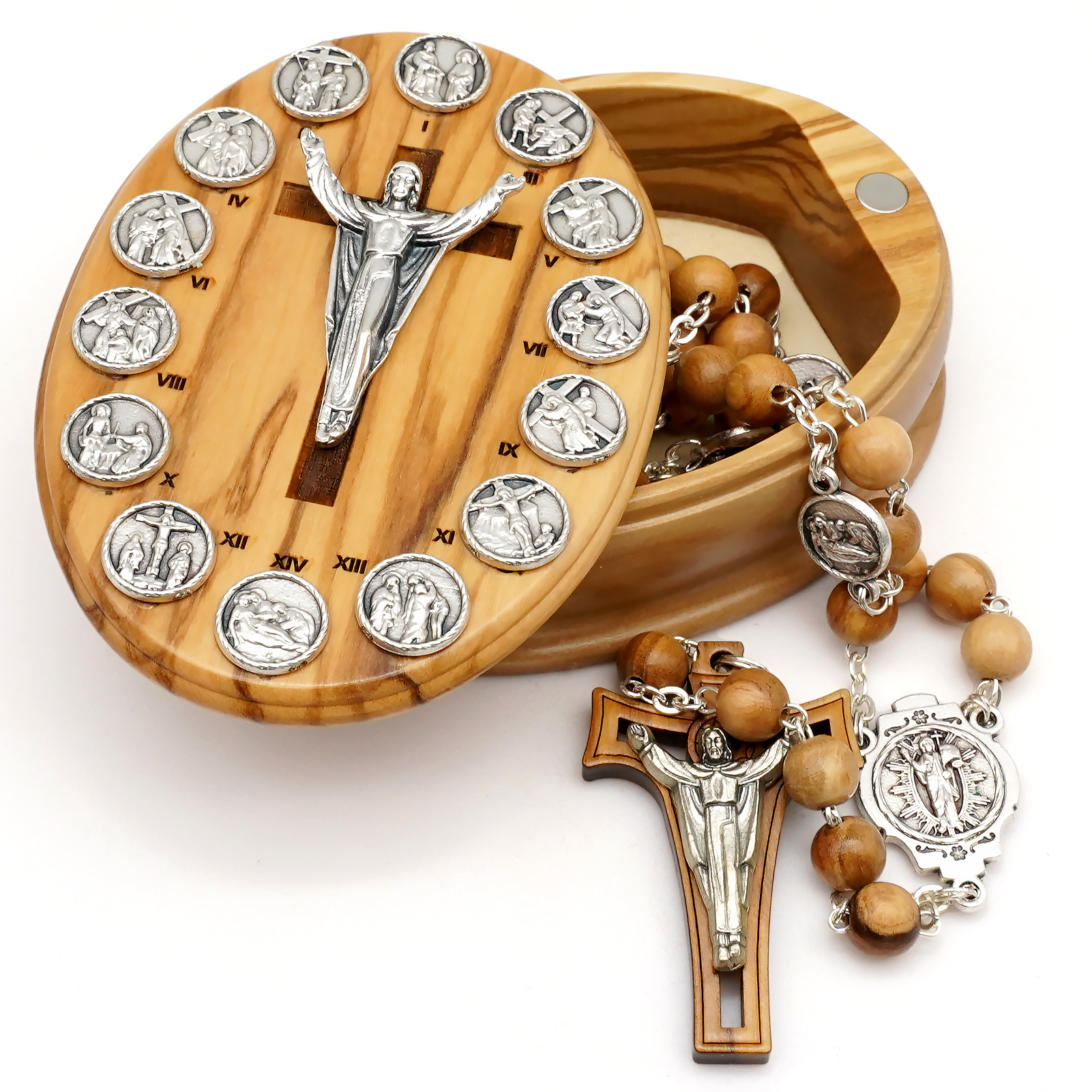 This set of via crucis rosary beads features 6mm olive wood beads and a matching storage box. Made in Italy, it includes all 15 mysteries of the rosary.