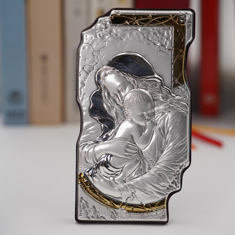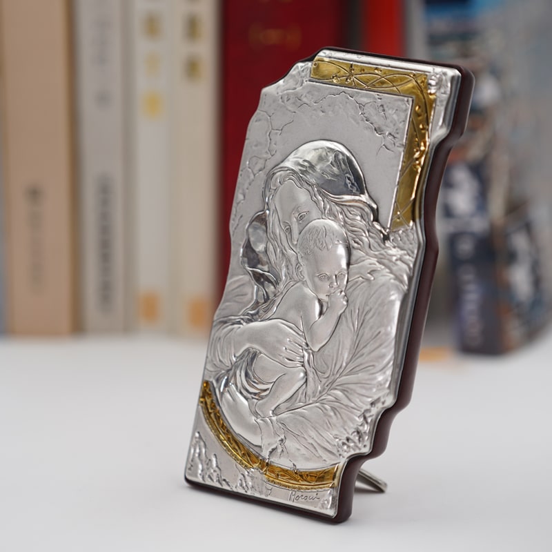 仿壁画银圣像-圣母抱耶稣-金色挂钩-12x7cm
